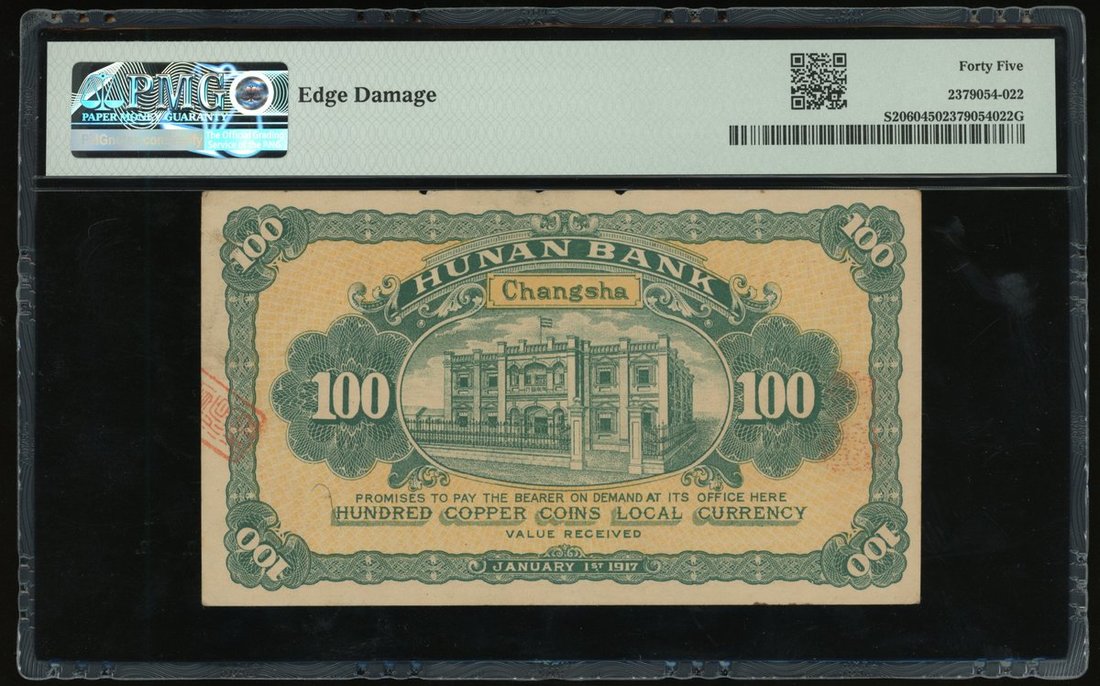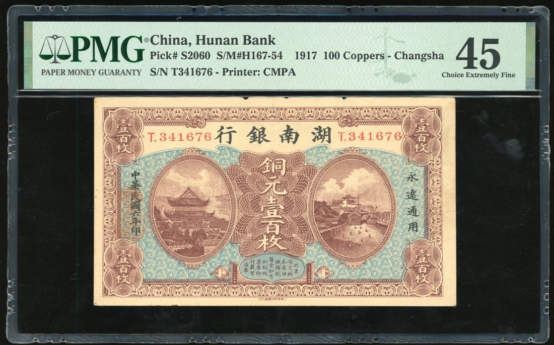 Hunan Bank, China, 100 coppers, Year 6 (1917), Changsha, serial number T341676, (Pick S2060), PMG 45, edge damage