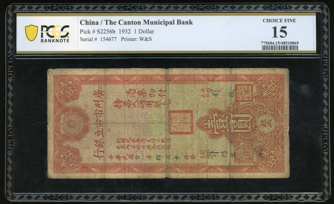 Canton Municipal Bank, China, 1 yuan, Year 21 (1932), serial number 154677, (Pick S2256b), PCGS 15
