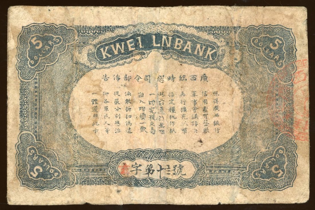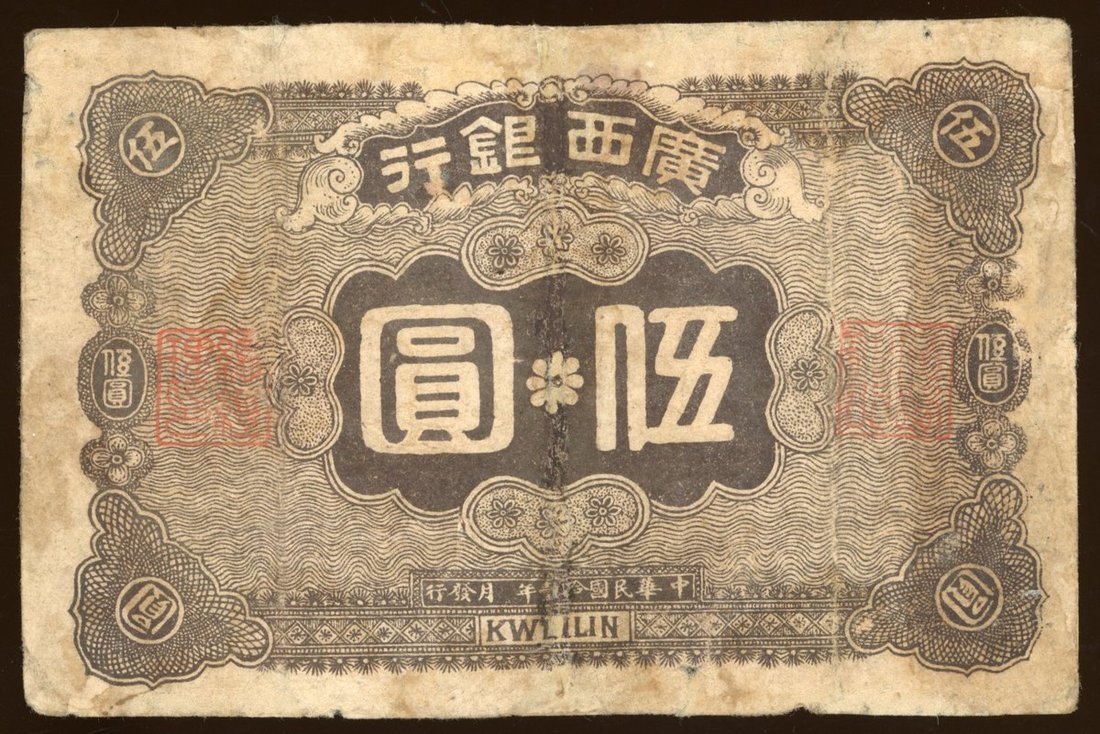 Kwangsi Bank, 5 yuan, Year 11 (1922), Kweilin, low serial number 13, Military issue, brown, red seals at left and right, reverse blue,