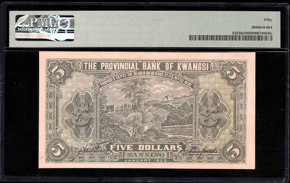 Provincial Bank of Kwangsi, China, 5 yuan, Nanning in green, Year 15(1926), serial number A1117287, (Pick S2326e), PMG 50 About Uncirculated, the highest grade in PMG population report.