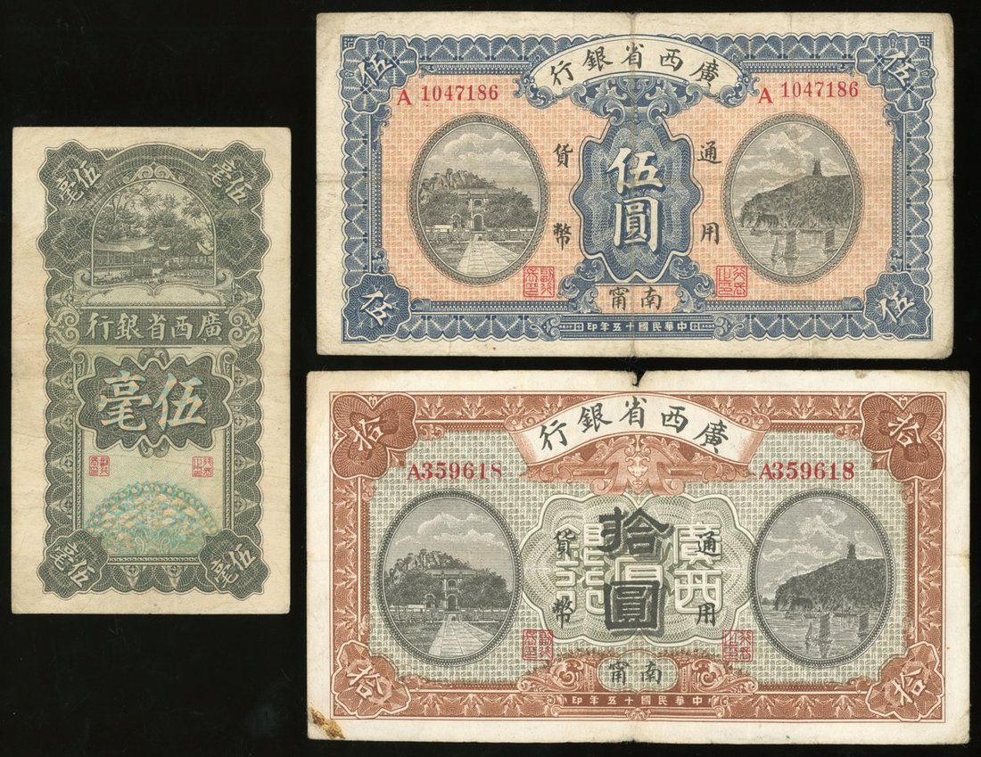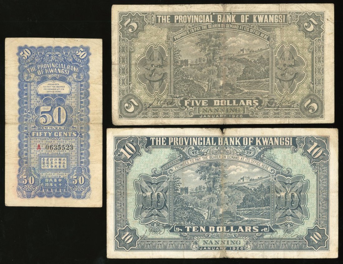 Provincial Bank of Kwangsi, China, a group of 3x, including, -5 and 10 yuan, Year 15 (19126),