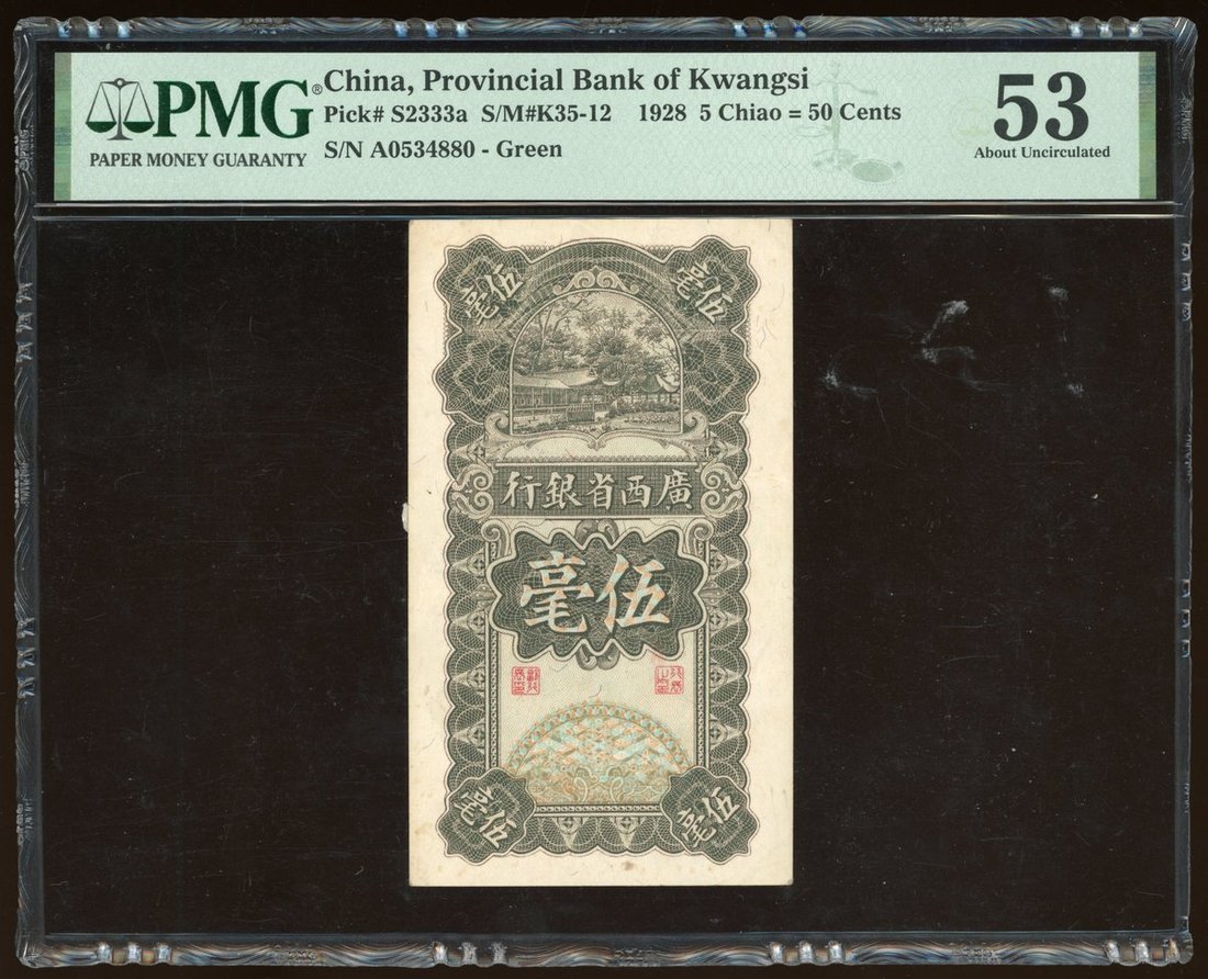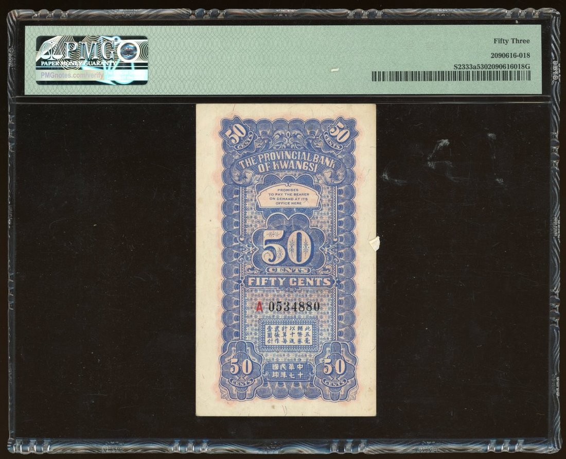 The Provincial Bank of Kwangsi, 50 cents, Year 17 (1928), serial number A 0534880, (Pick S2333a), PMG 53 About Uncirculated, the second highest grade in the PMG census
