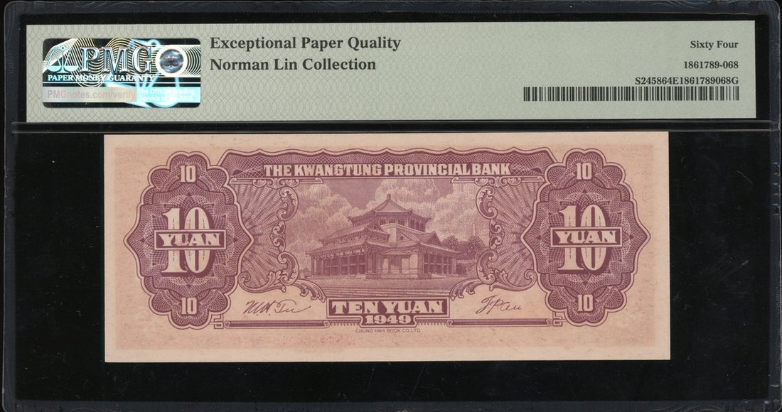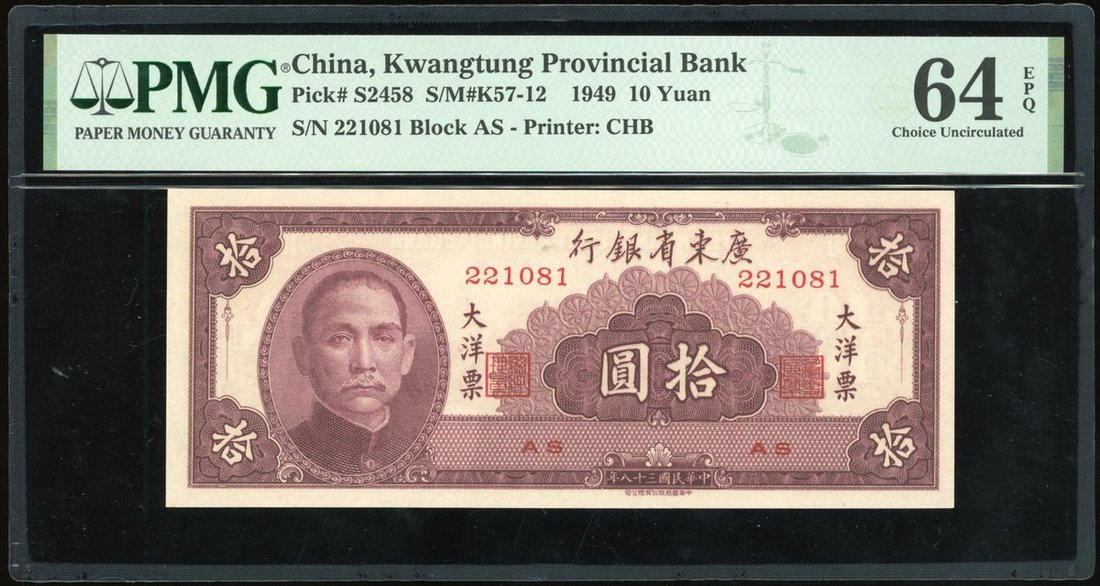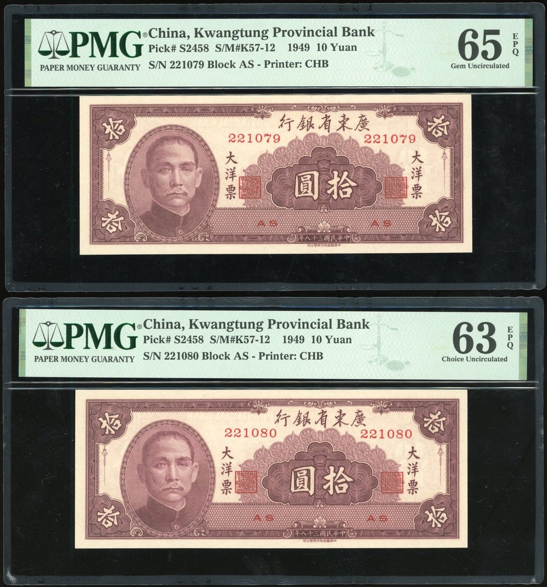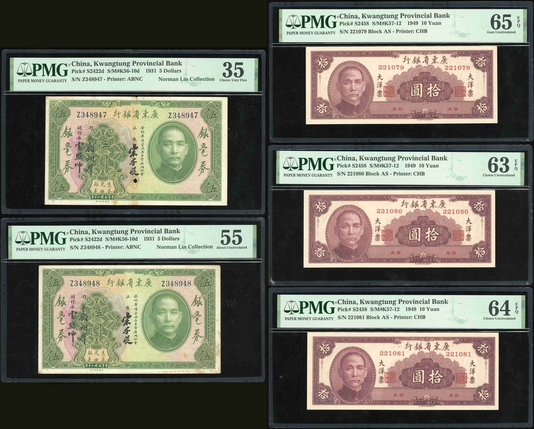 Kwangtung Provincial Bank, China, 2 consecutive groups, consists of 2x $5, Year 20(1931) and 3x 10 yuan, Year 38(1949), serial numbers Z348947-948, 221079-81 AS, (Pick S2422d and S2458), graded PMG 35 (Small Holes), 55 (Minor Stains), 65EPQ, 63EPQ adn 64EPQ respectively (5).