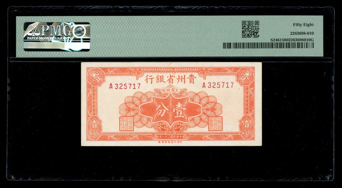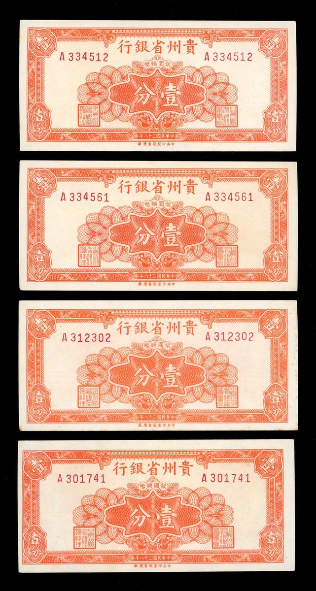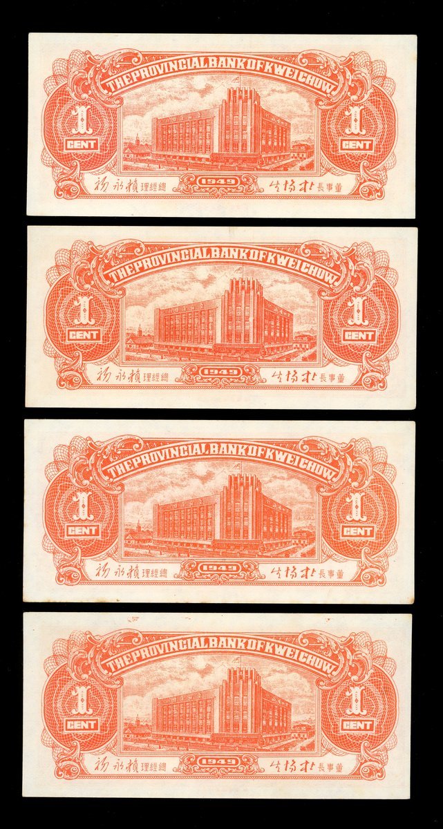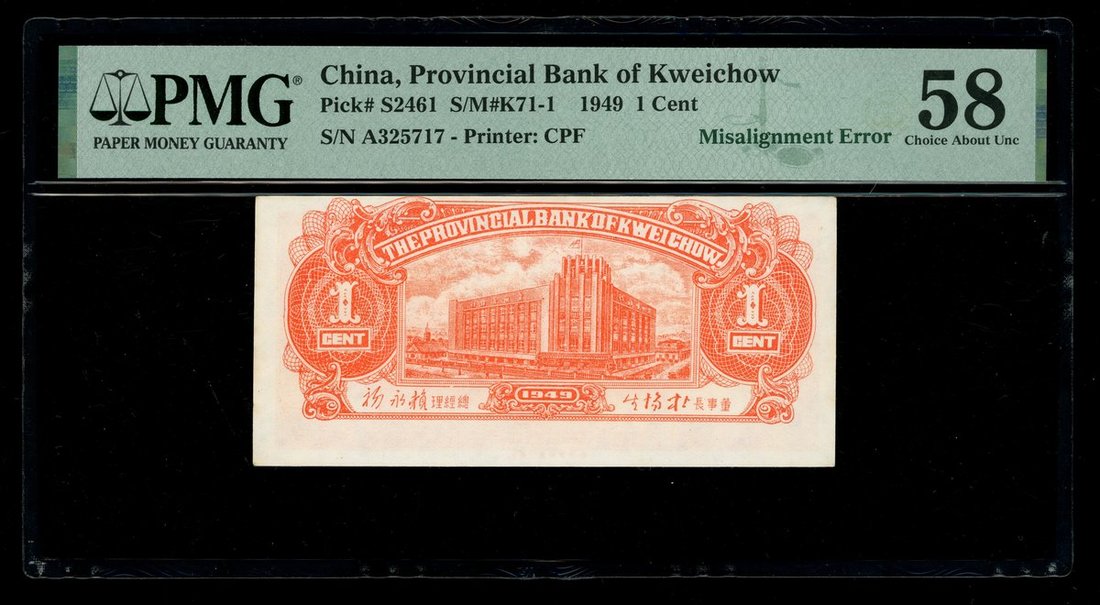 Provincial Bank of Kweichow, a lot of 5x1 cent, 1949, serial number A325717, A312302, A301741, A334512 and A334561, the first one misalignment error, (Pick S2461), the error graded PMG 58, the rest uncirculated with minor stains or foxing.(5)