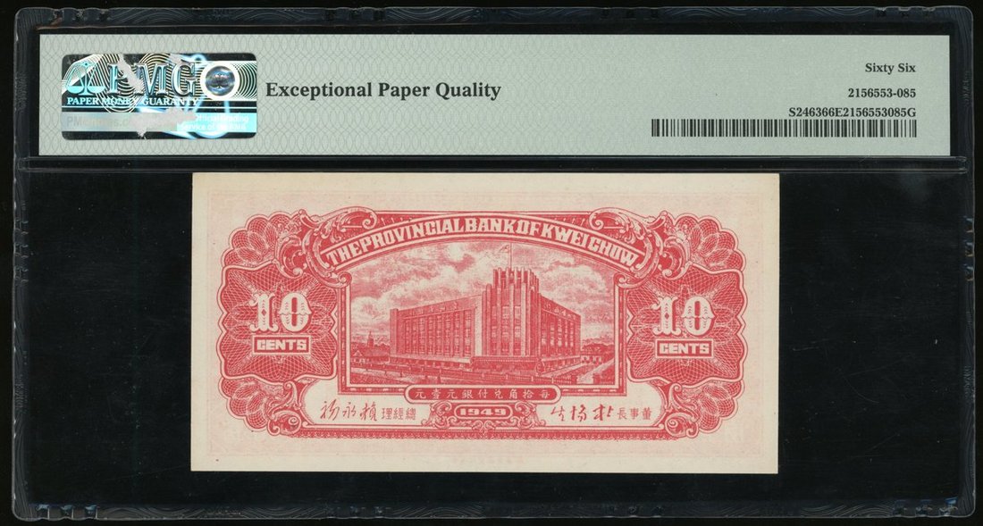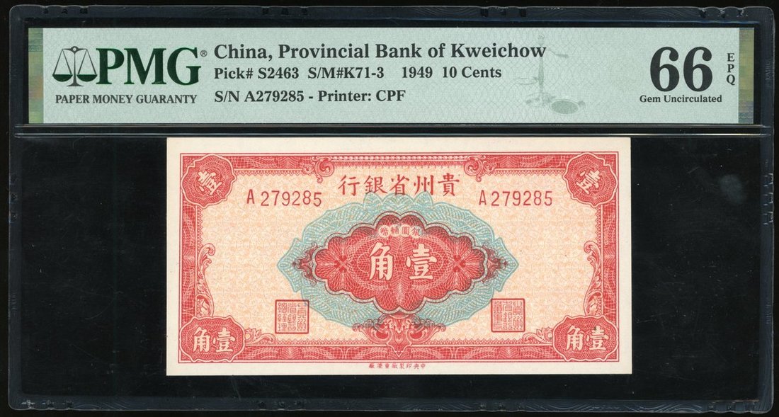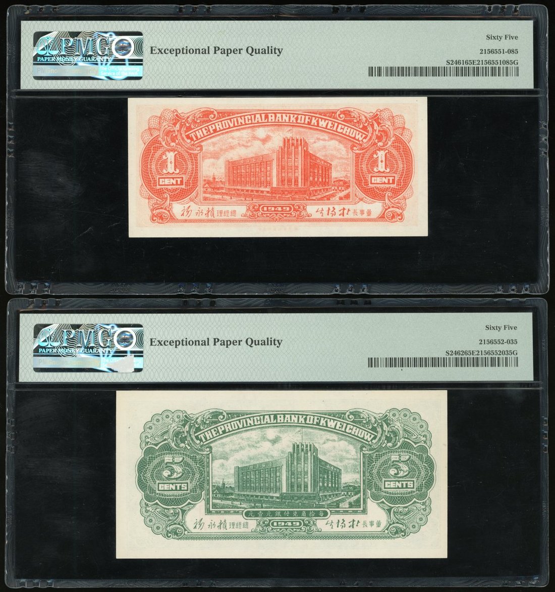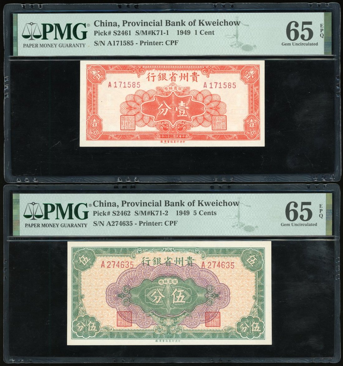 Provincial Bank of Kweichow, China, a group of 3x, including 1, 5 and 10 cents, Year 38 (1949), (Pick S2461-S2463), PMG 65EPQ, 65EPQ and 66EPQ respectively (3)