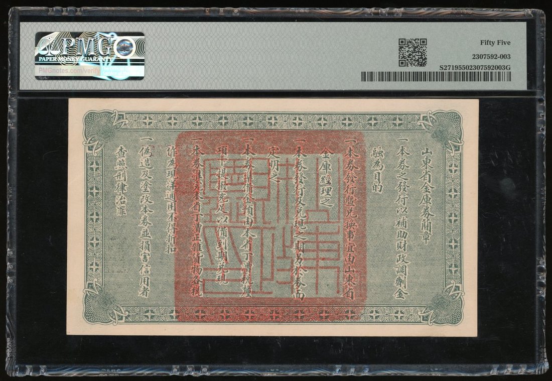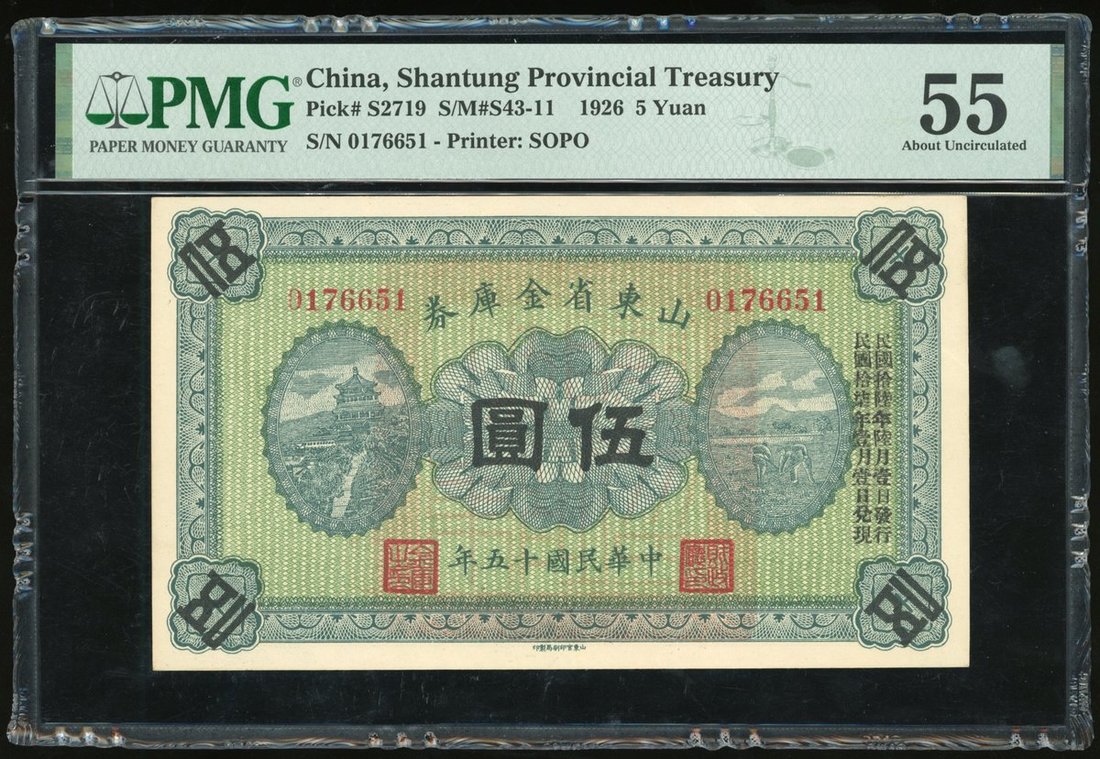 民國十五年(1926)山東省金庫券伍圓,編號0176651,PMG 55