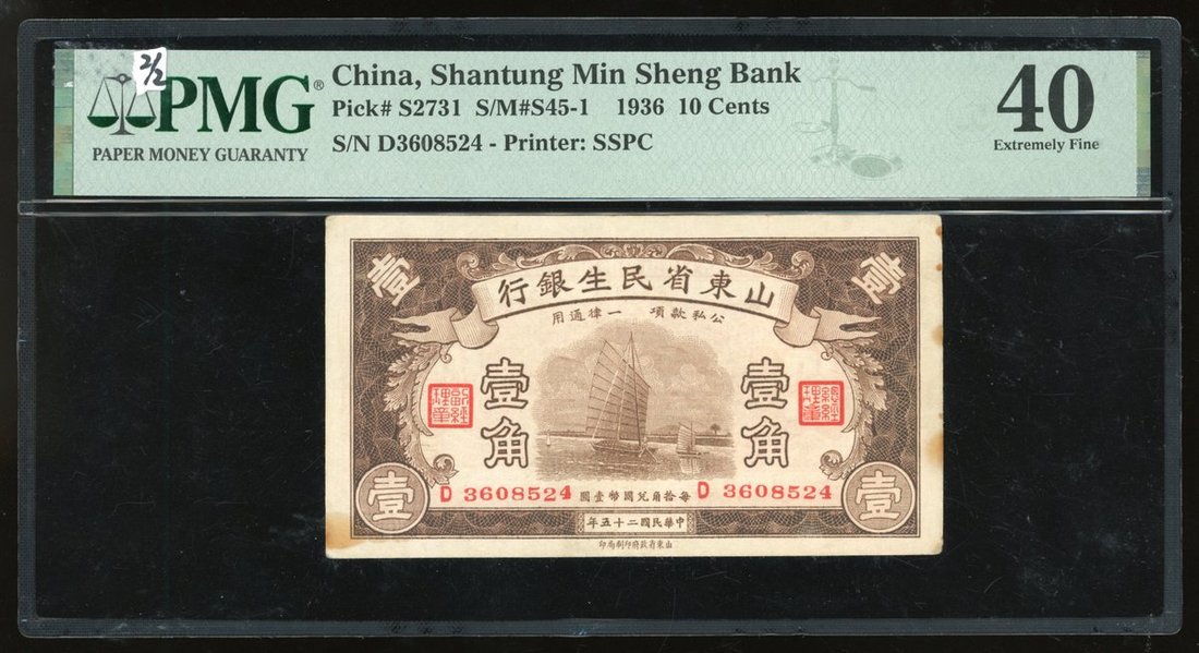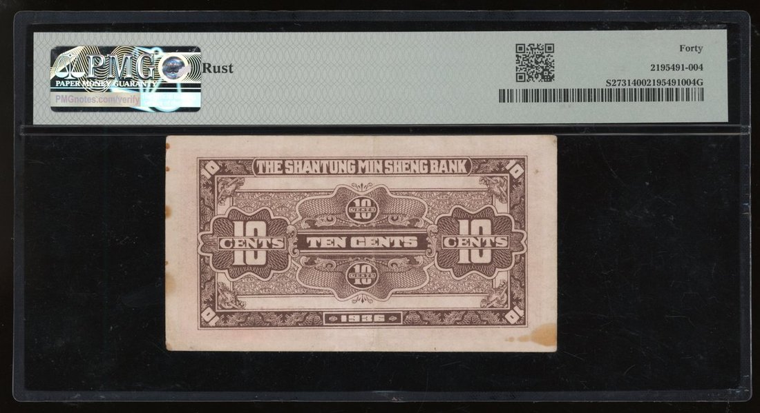 Shantung Min Sheng Bank, China, 10 cents, Year 25 (1936), serial number D3608524, (Pick S2731), PMG 40, rust