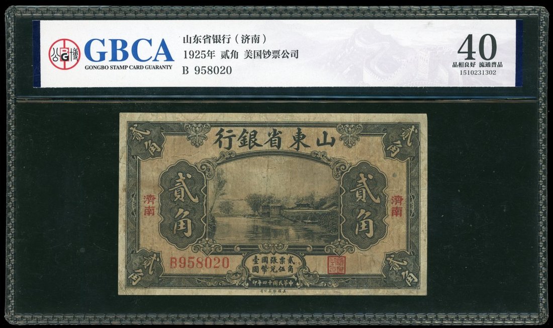 民國十四年(1925)山東省銀行貳角,濟南地名,編號B958020,VF,GBCA 40