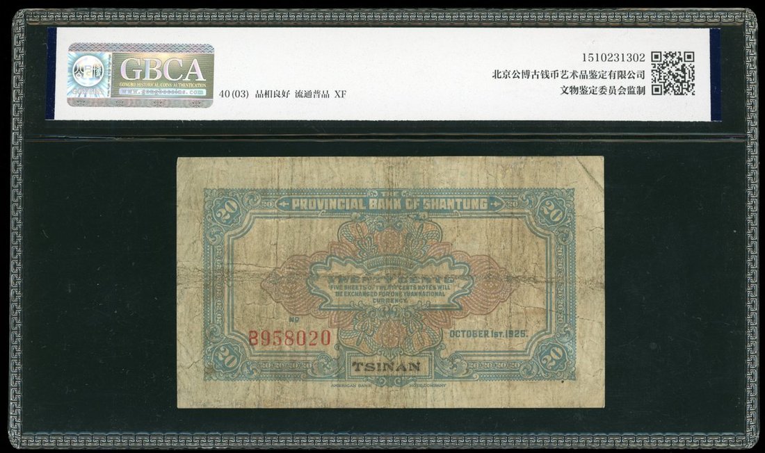 The Provincial Bank of Shantung, China, 20 cents, 1925, Tsinan, serial number B 958020, (Pick S2755a), Very Fine, GBCA 40