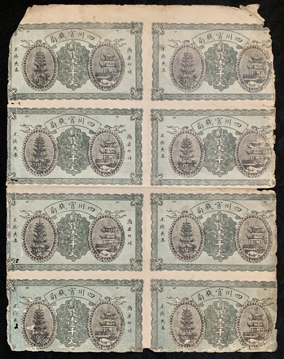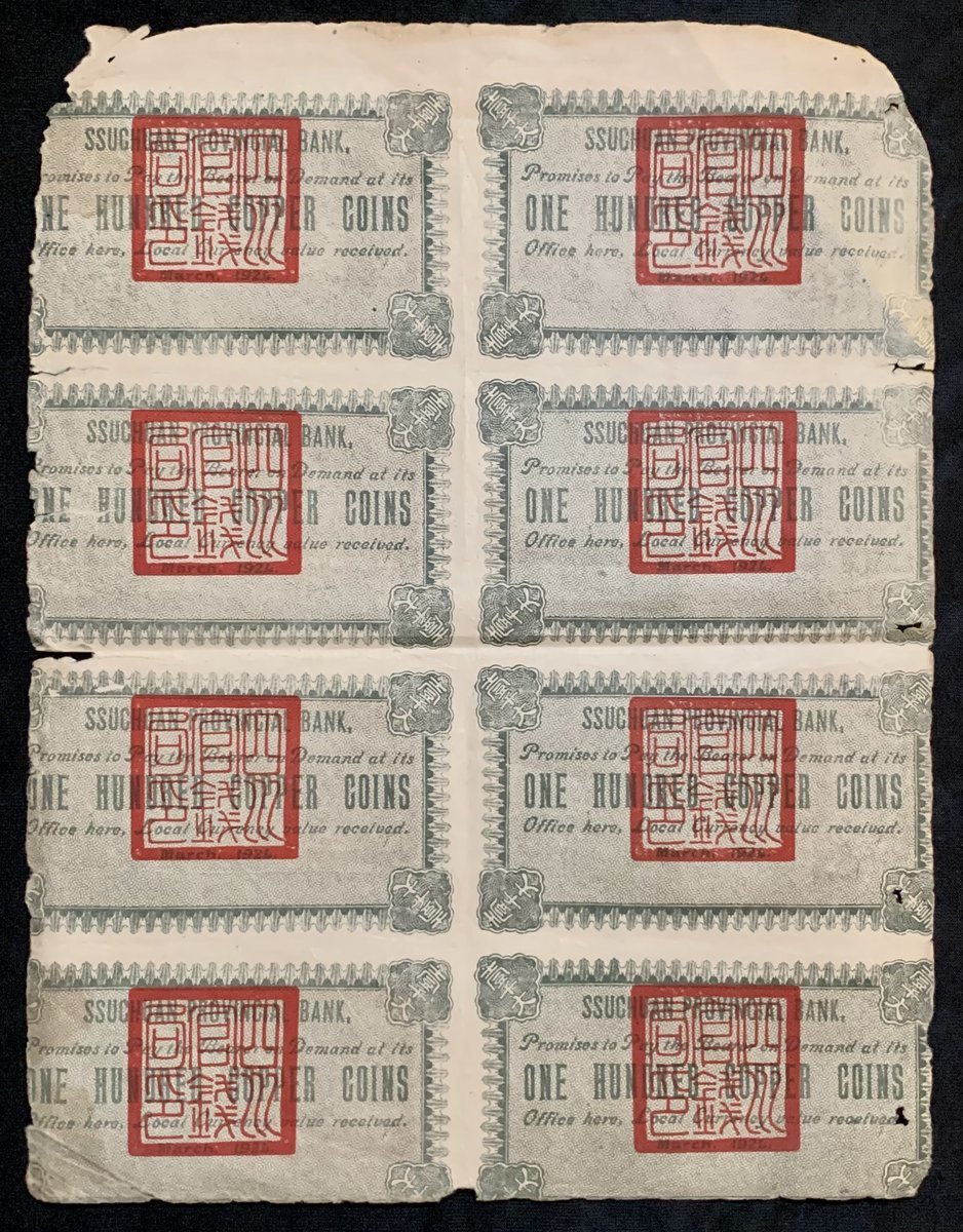 Ssuchuan Provincial Bank, an uncut sheet of 8x one hundred copper coins(1000 wen), 1924, black and green on obverse, pagoda at left and right, reverse green English text and large red chop at centre,