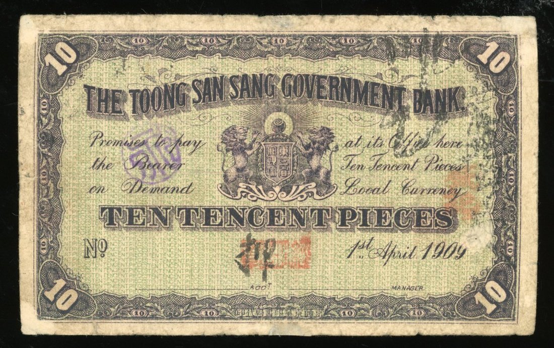 Toong San Sang Government Bank, China, 10 cent pieces, 1st Year of Xuantong (1909), serial number fu 0003548, (Pick S2858), with annotataions and stamps, repaired, fine. A scarce early issue