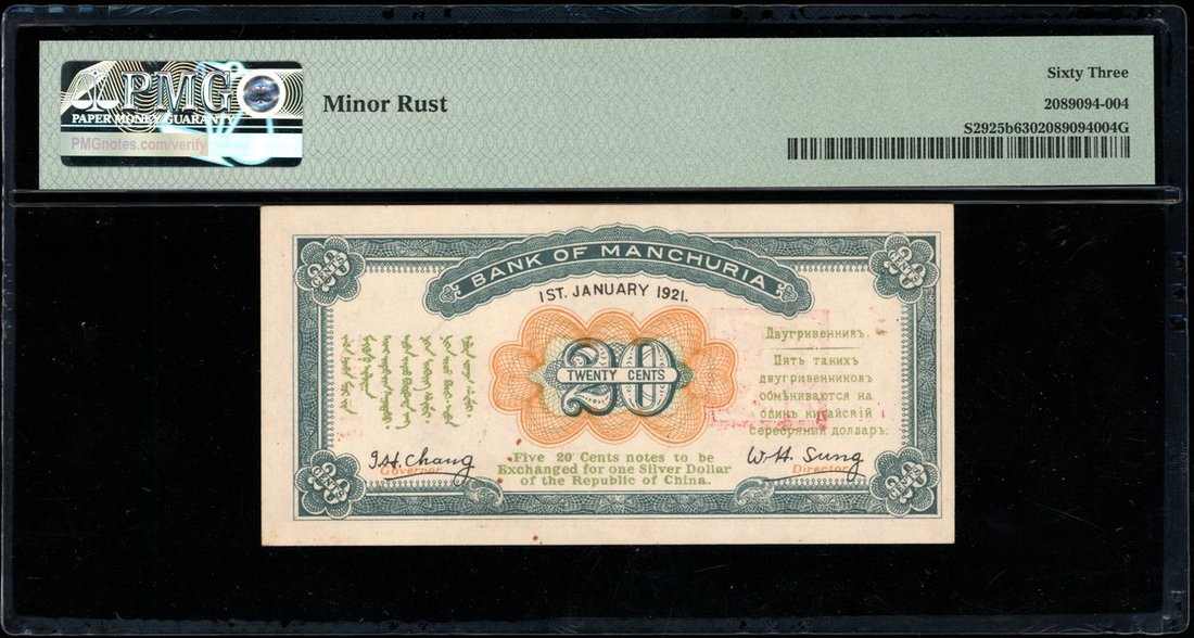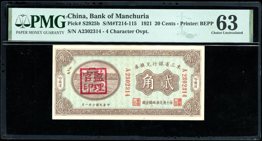 民國十年東三省銀行兌換券貳角,編號A2302314,左方紅印,PMG 63,輕微銹漬,PMG亞軍分