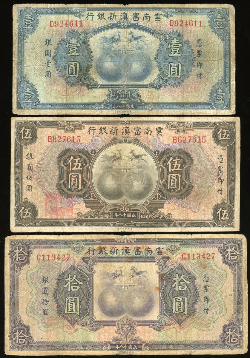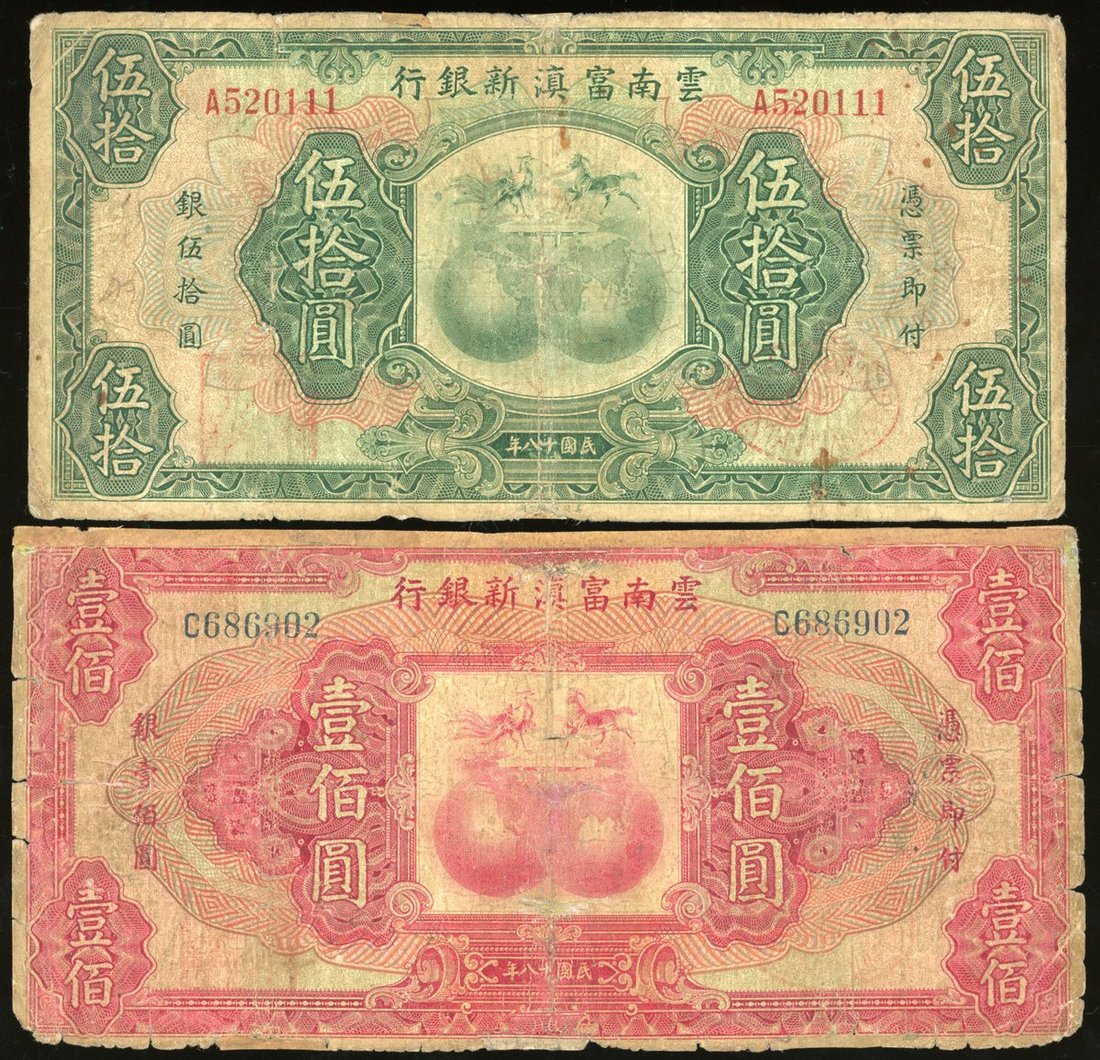 民國十八年(1929)雲南新富滇銀行一組5枚,包括壹圓,伍圓,拾圓,伍拾圓,壹佰圓,部分有修補,基本VG品