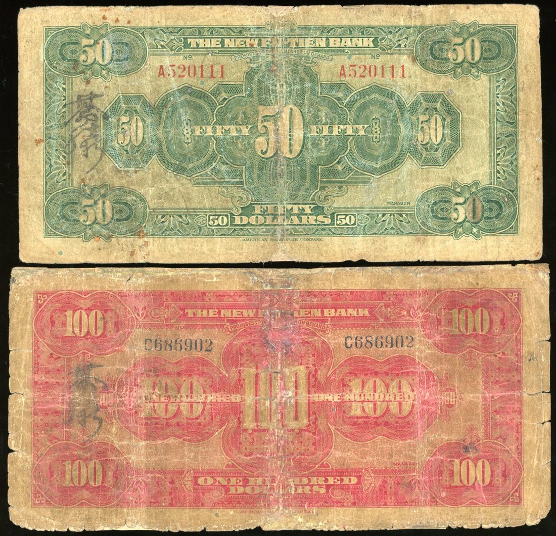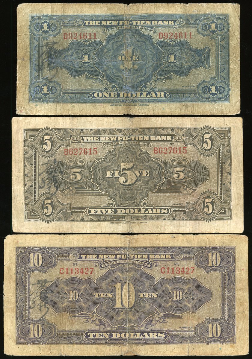 The New Fu-Tien Bank, China, a set of the Year 18 (1929) issue, including, 1, 5, 10, 50 and 100 yuan, (Pick S2996-S3000), some with repair, generally very good (5)