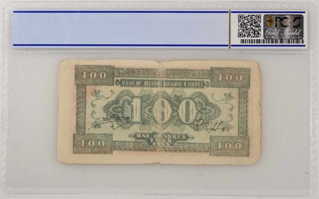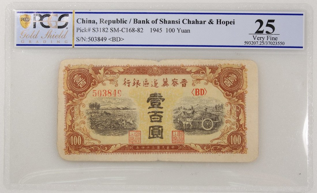 Bank of Shansi Chahar & Hopei, China, 100 yuan, 1945, serial number 503849 BD, (Pick S3182), PCGS Gold Shield 25.