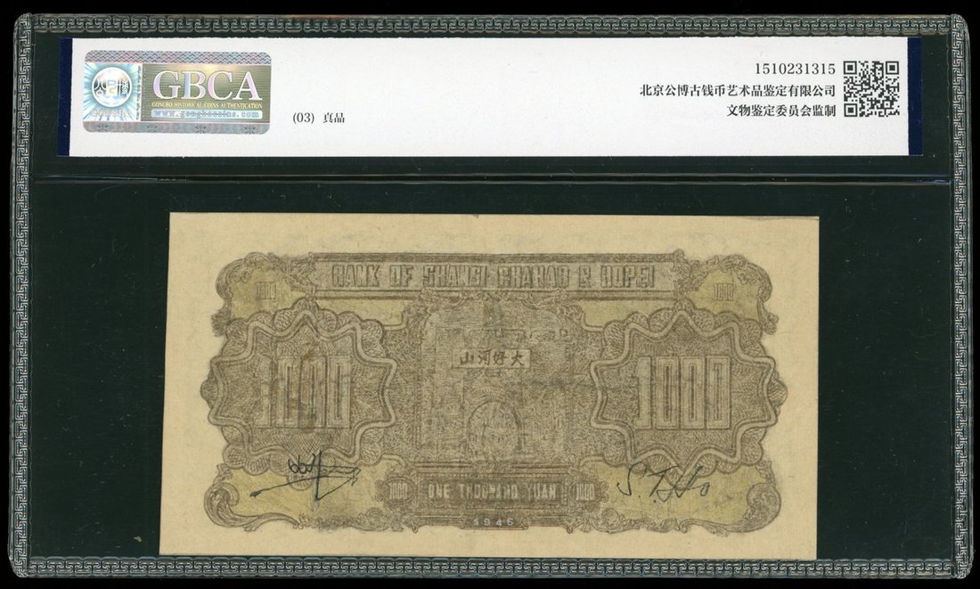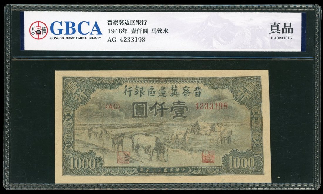 民國三十五年(1946)晉察冀邊區銀行壹仟圓,編號4233198,均為AVF, 有大面積修復及重新描繪,GBCA Genuine
