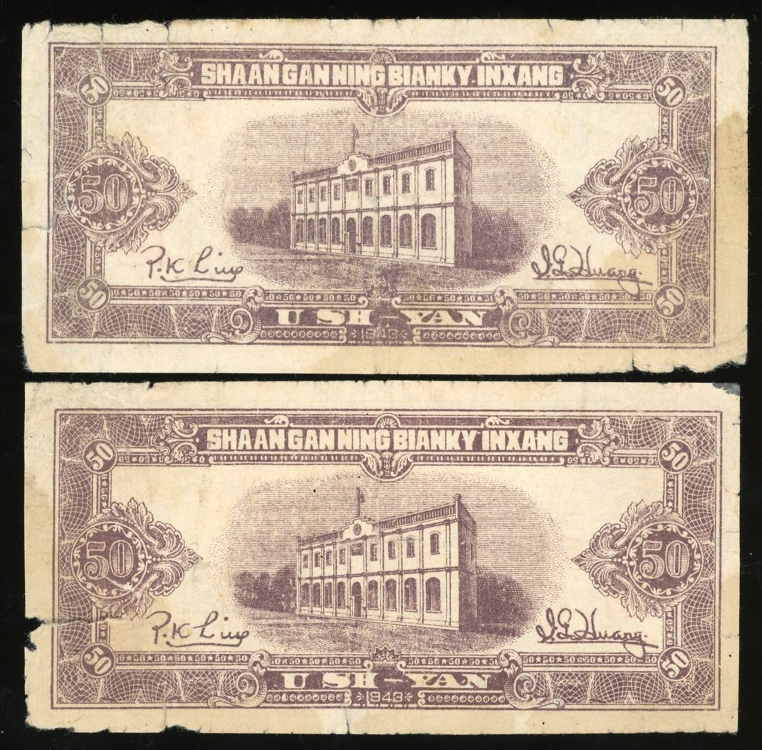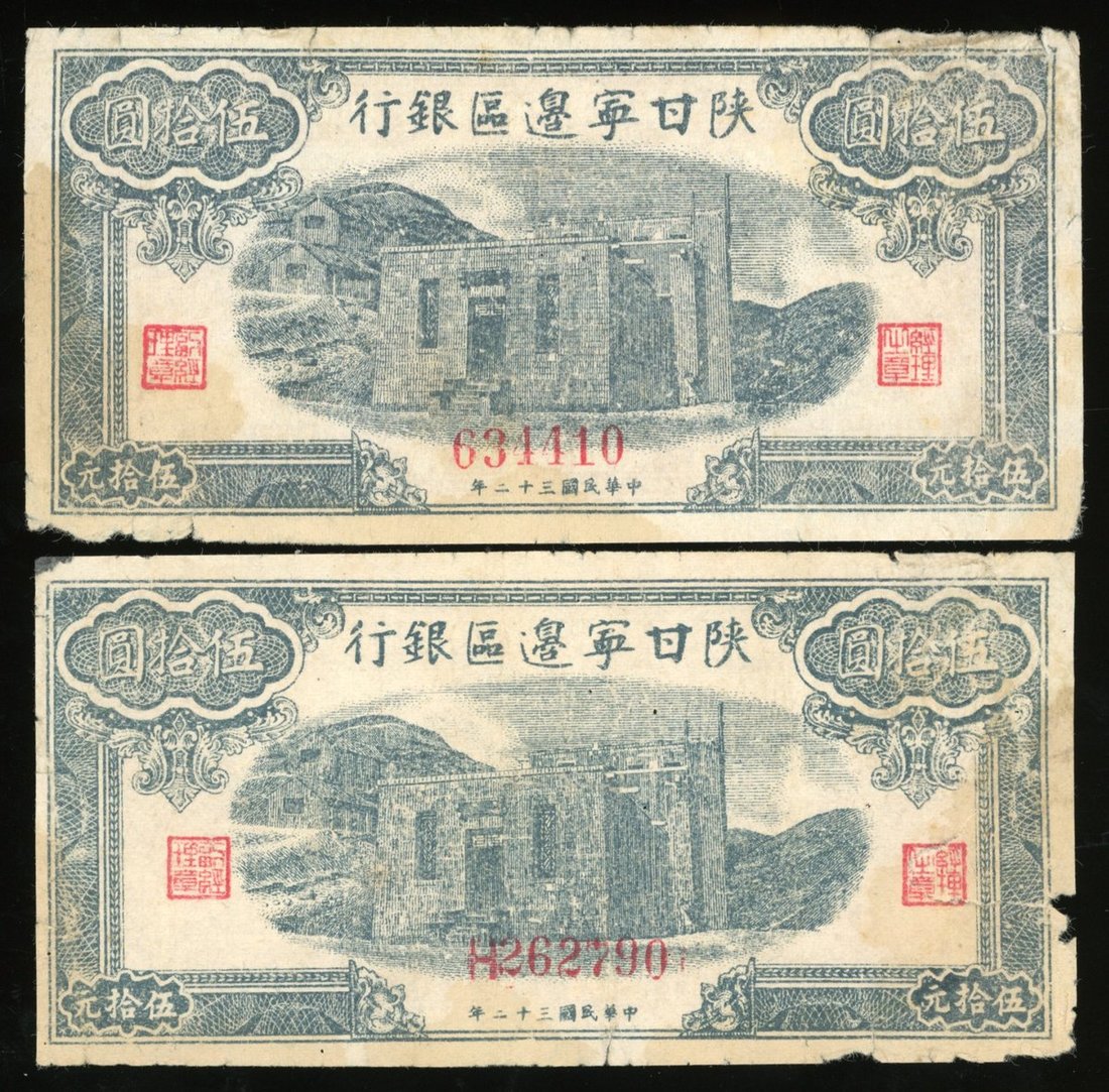 Shaan Gan Ning Bianky Inxang, a pair of 50 yuan, 1943, serial number 634410 and H262790, (Pick S3662), edge damages, stains, good fine.(2)