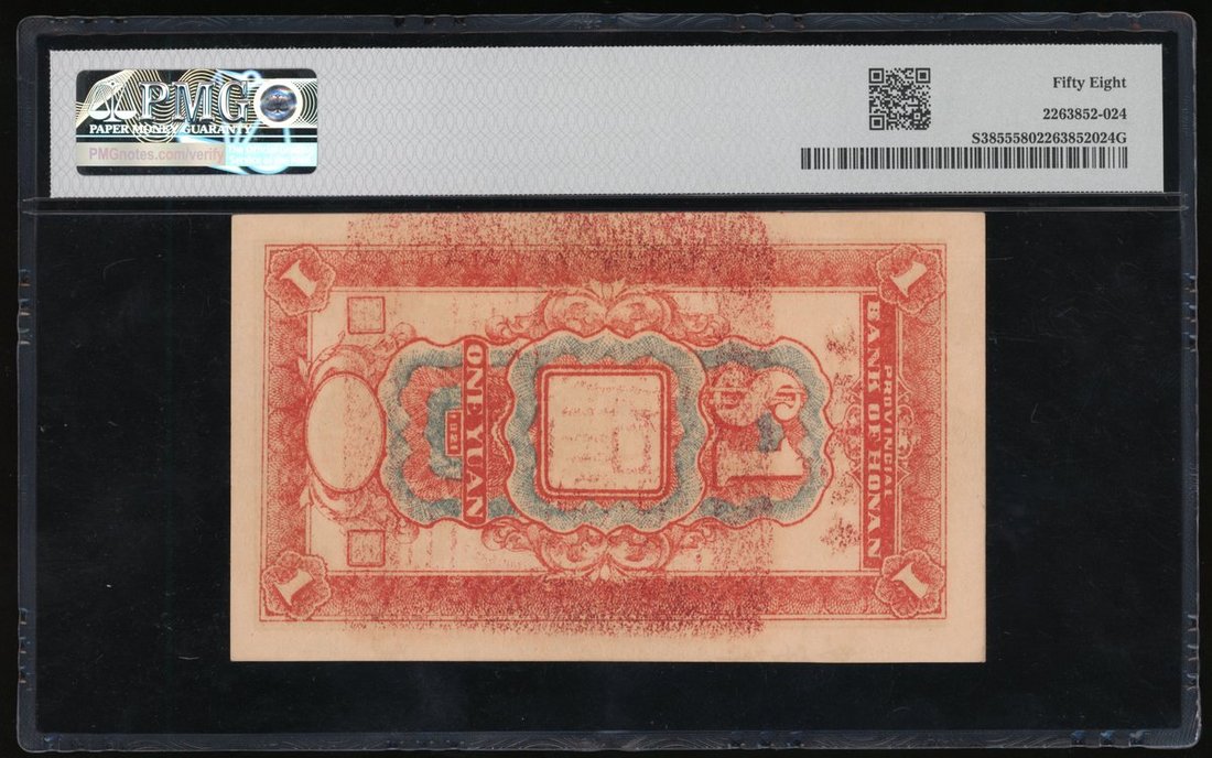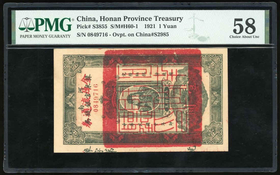 民國十年(1921)河南豫泉官銀錢局壹圓,編號0849716,中心蓋有大紅戳,PMG 58