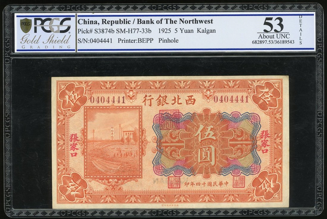 民國十四年西北銀行伍圓,張家口地名,編號0404441,PCGS Gold Shield 53 Details,有針孔