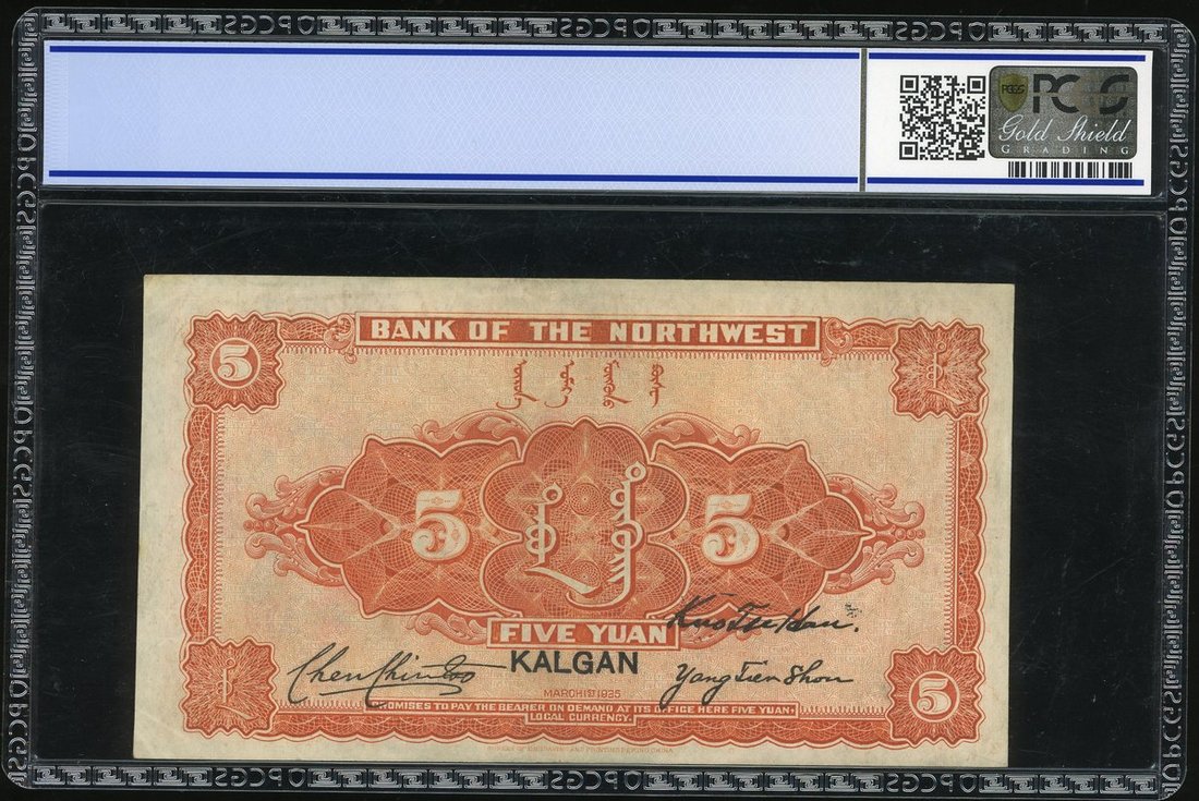 Bank of the Northwest, China, 5 Yuan, 1925, Kalgan, serial number 0404441, (Pick S3874b), PCGS Gold Shield 53 Details (Pinhole)
