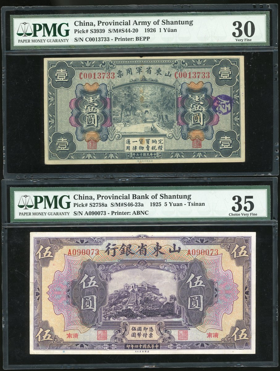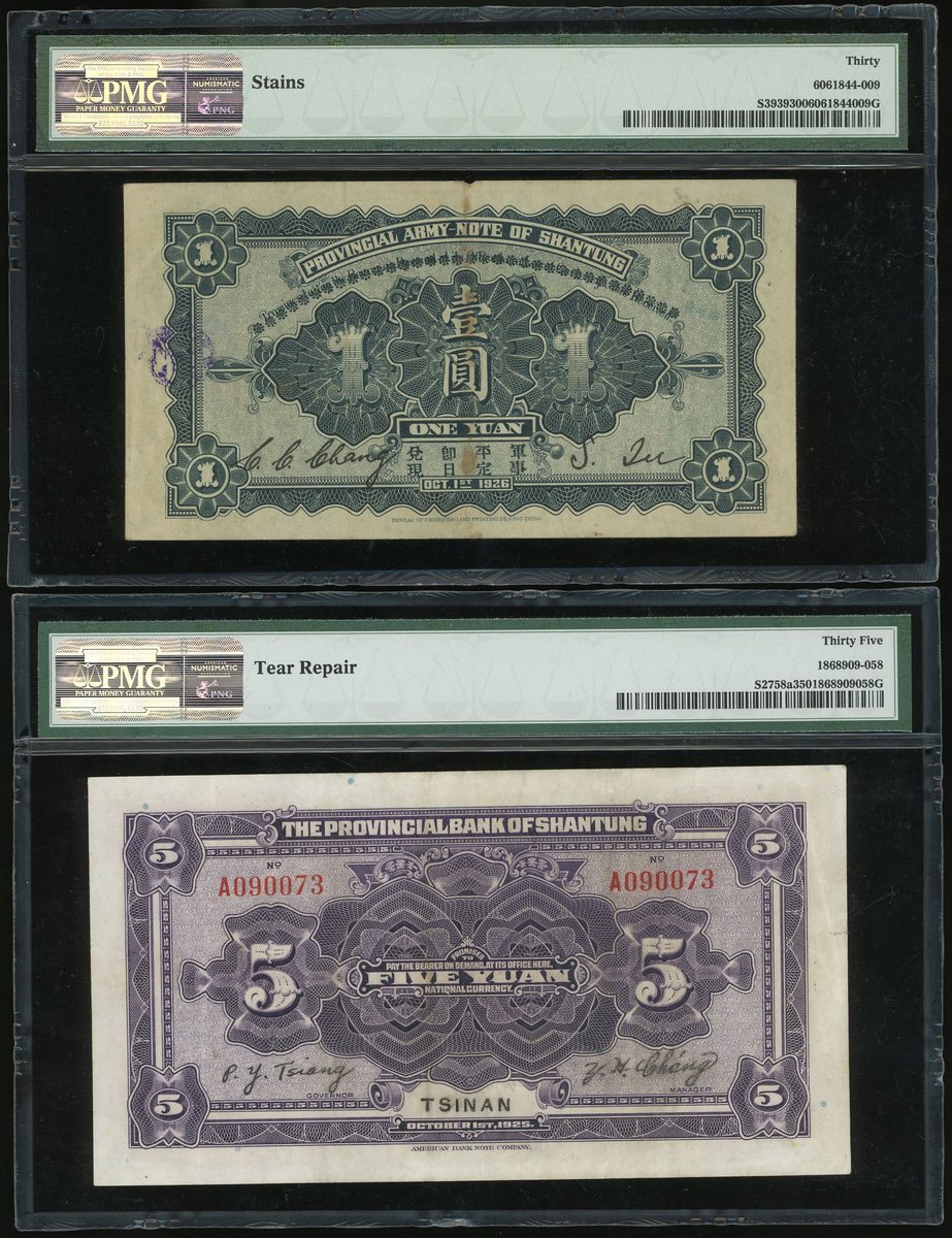 山東省紙幣一組兩枚,民國十五年山東省軍用票壹圓,編號C0013733及山東省銀行伍圓,濟南地名,編號A090073,均PMG 30-35,有污漬,第二枚有修補