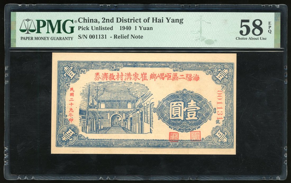 2nd District of Hai Yang, Private Issue, China, 1 yuan, 1940, serial number 001131, (Pick unlisted), PMG 58EPQ