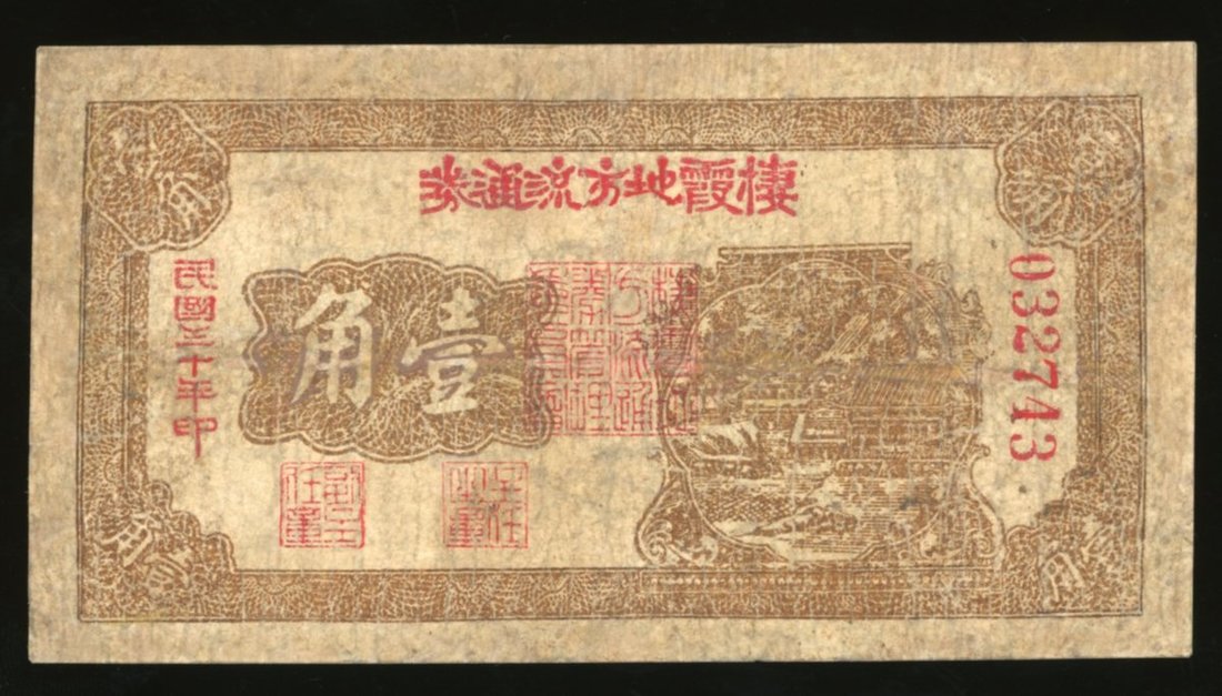 Qixia Local Currency, Shantung Province, China, 1 chiao, 1941, serial number 032743, liberated areas regional issue for Chiaotung, brown, red seals at centre, reverse green,