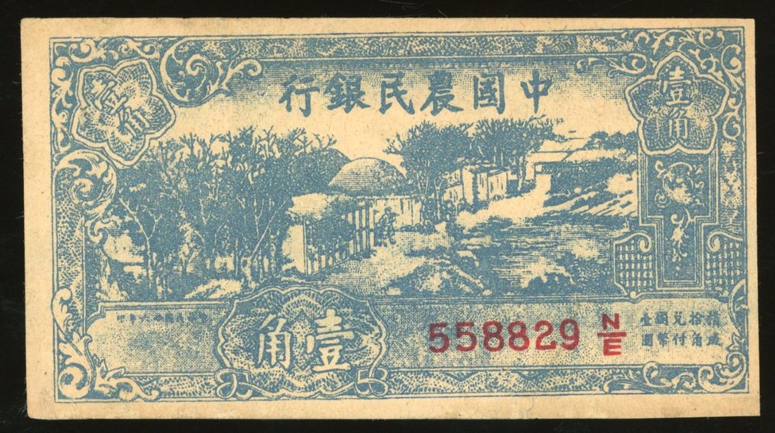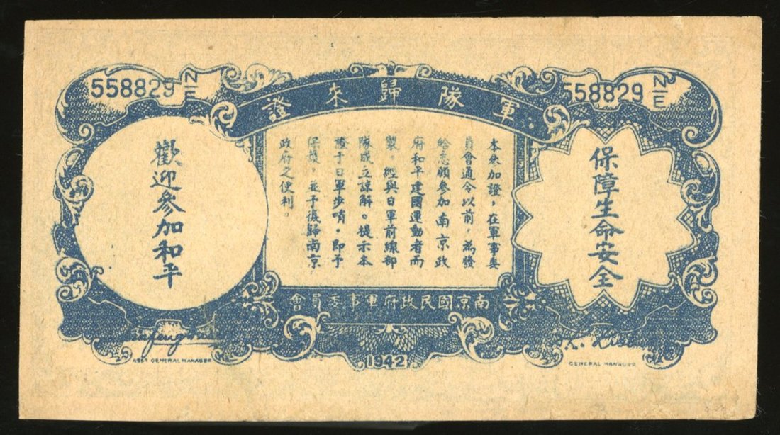 Nanking Government Pass / Farmers Bank of China, small format certificate, 1942, serial number 558829 N/E, stained, about extremely fine