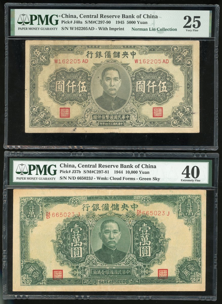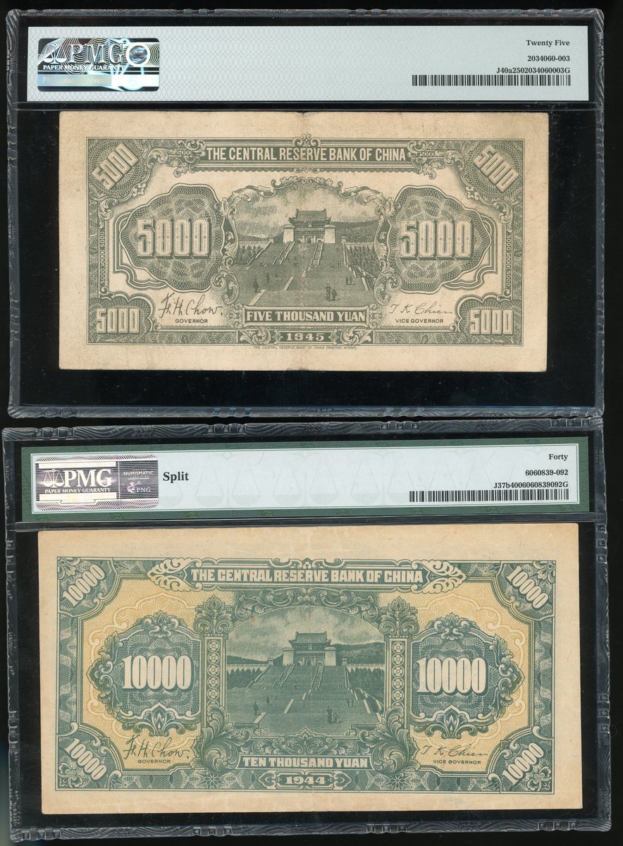 Central Reserve Bank of China, a pair, including 5,000 and 10,000 Yuan, 1944 and 1945, (Pick J40a, J37b), PMG 25 Very Fine-40 Extremely Fine (Split) (2)