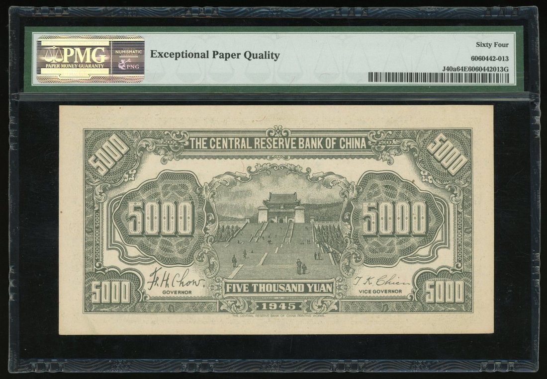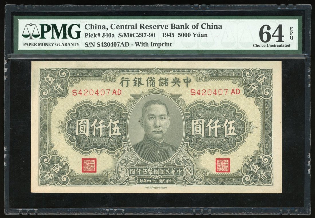Central Reserve Bank of China, 5000 yuan, Year 34 (1945), serial number S420407AD, (Pick J40a), PMG 64EPQ