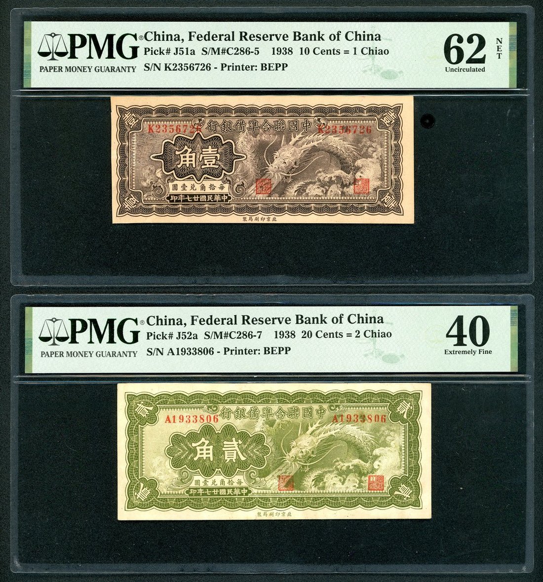 民國二十七年中國聯合準備銀行一組3枚,包括壹,貳及伍角,分別評PMG 62NET,40及53(褪色),一貫熱門的"飛龍"系列