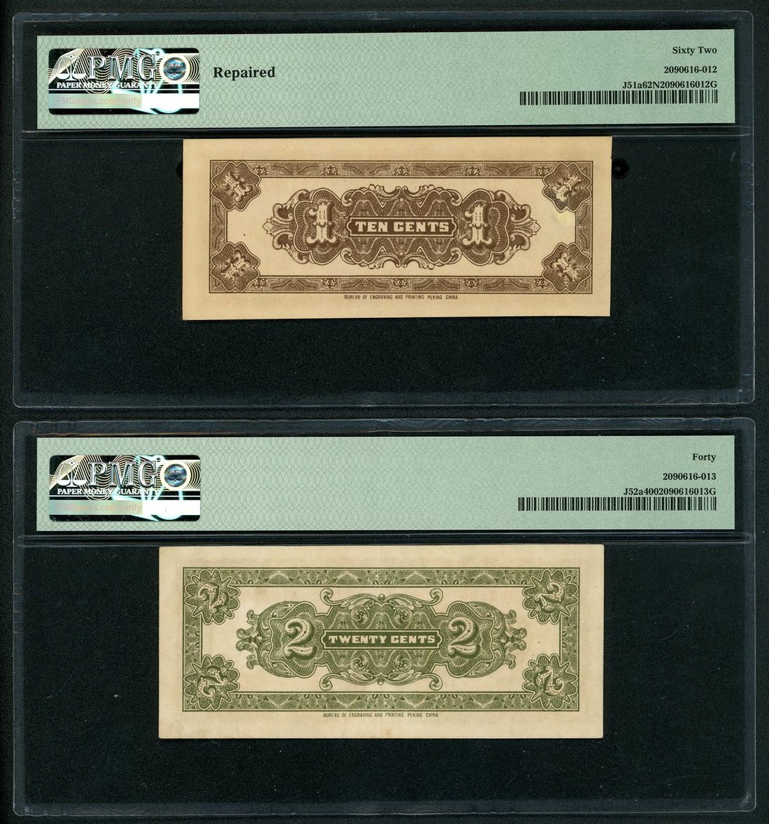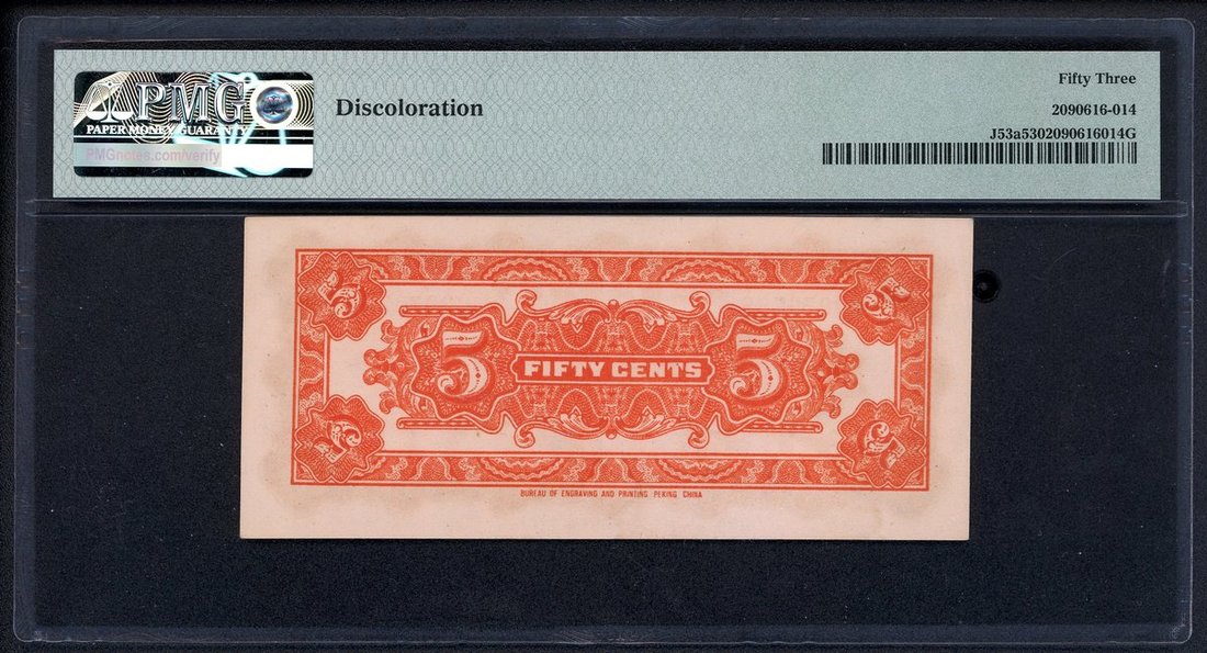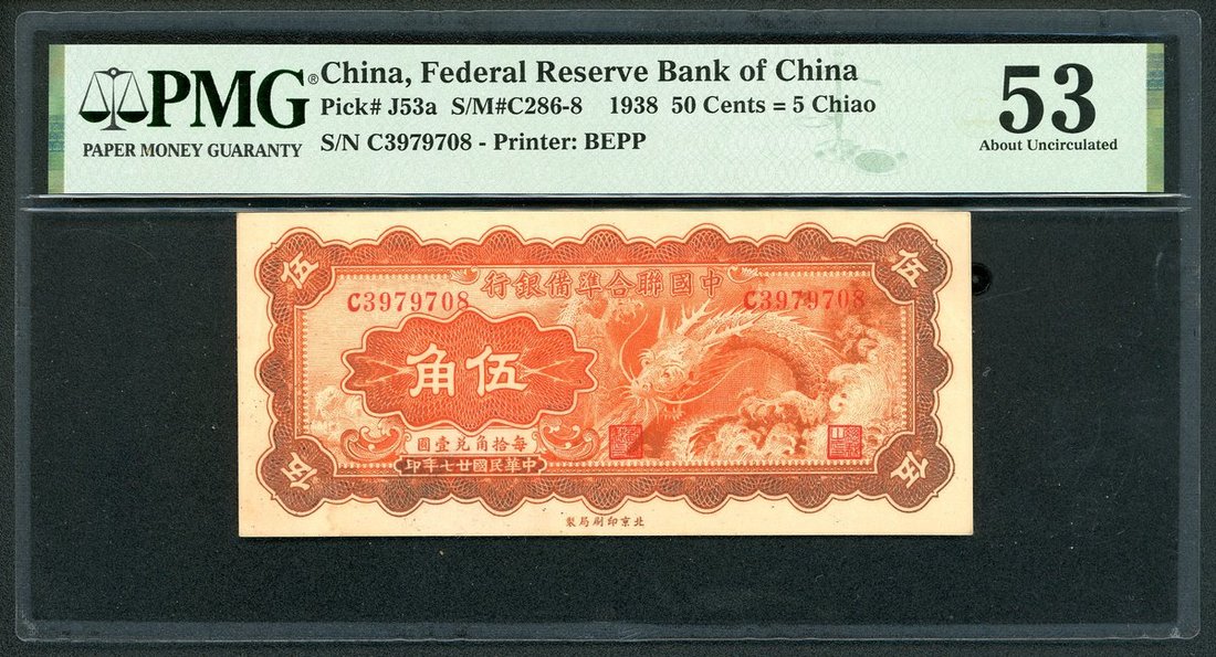 Federal Reserve Bank of China, a group of minor issues, including 10, 20 and 50 cents, Year 27 (1938), (Pick J51a, J52a, J53a), PMG 62NET (repaired), 40, 53 (discoloration) respectively. Part of the always popular 'flying dragon' series (3)