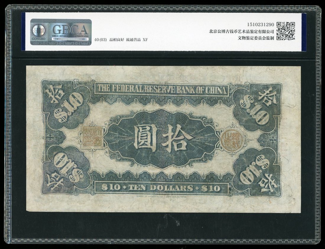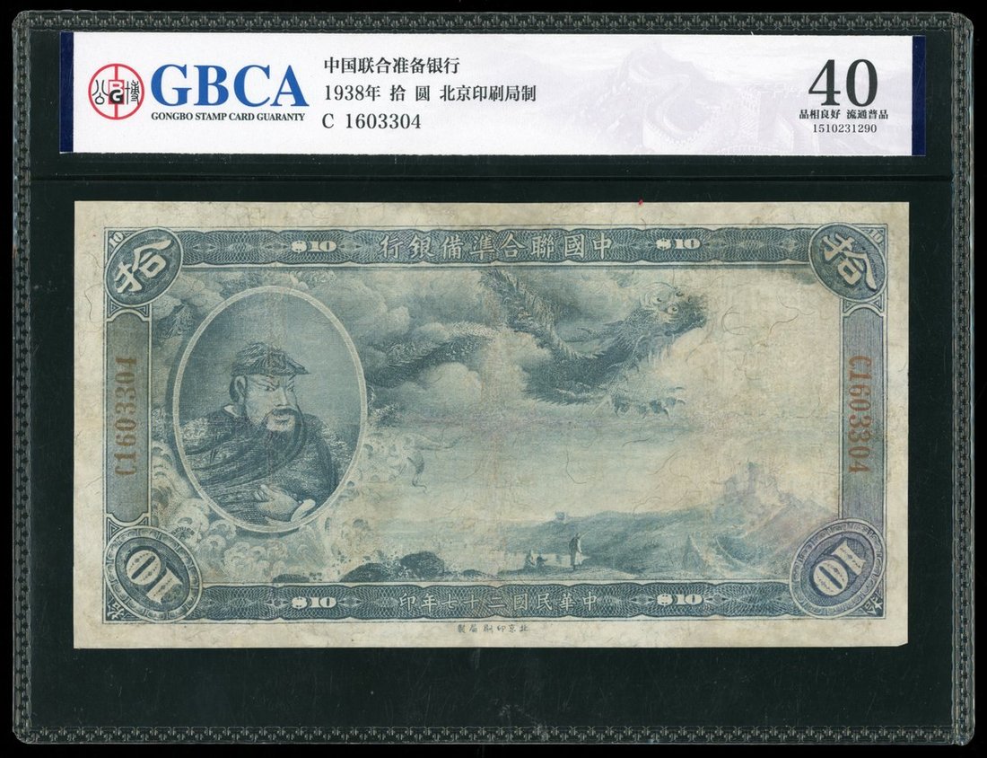 民國二十七年中國聯合儲備銀行拾圓,編號C1603304,AVF,GBCA 40