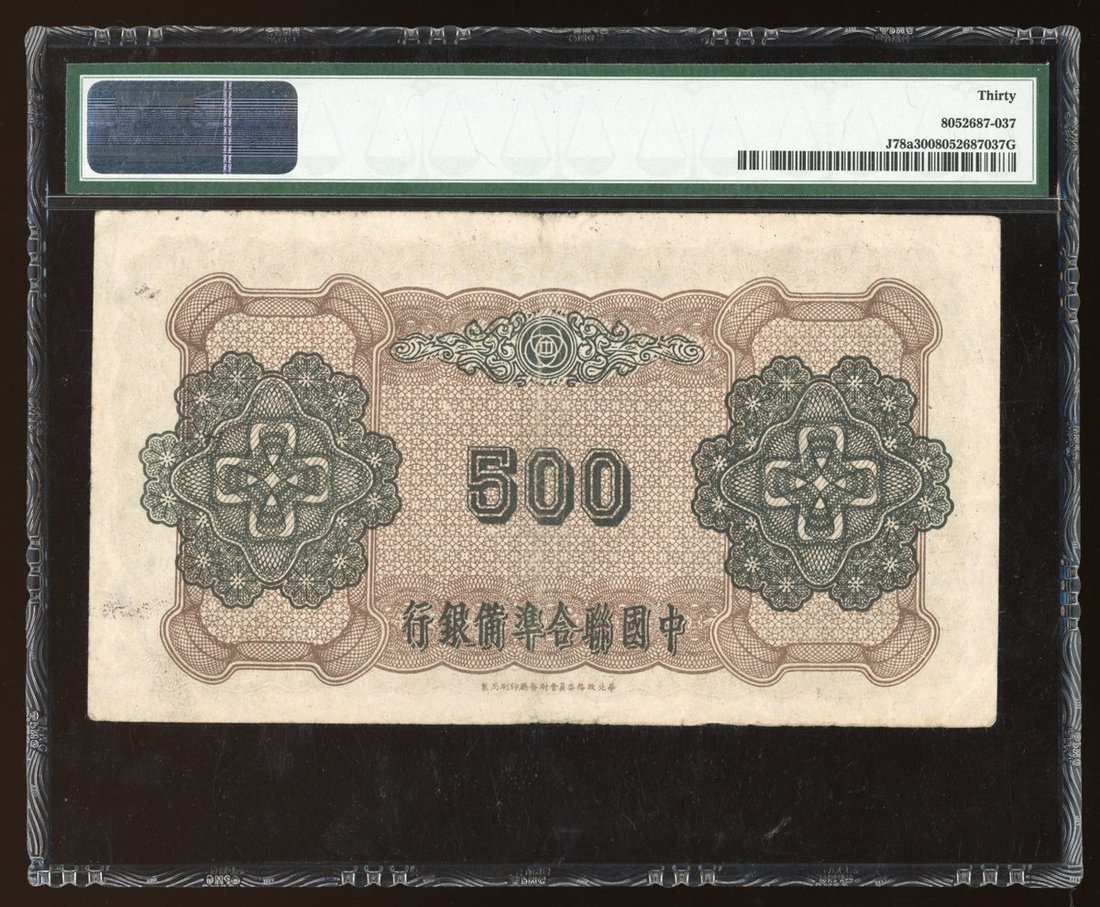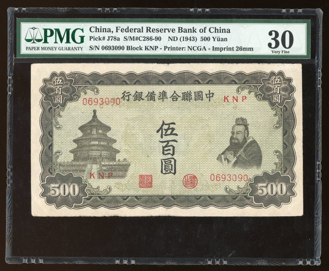 China Puppet Banks, a group of 3x including, Central Bank of Manchukuo 1994 1 yuan, Federal Reserve Bank of China 1943 500 yuan (2), (Pick 135b, J78a), PMG 30, Very Fine (3)