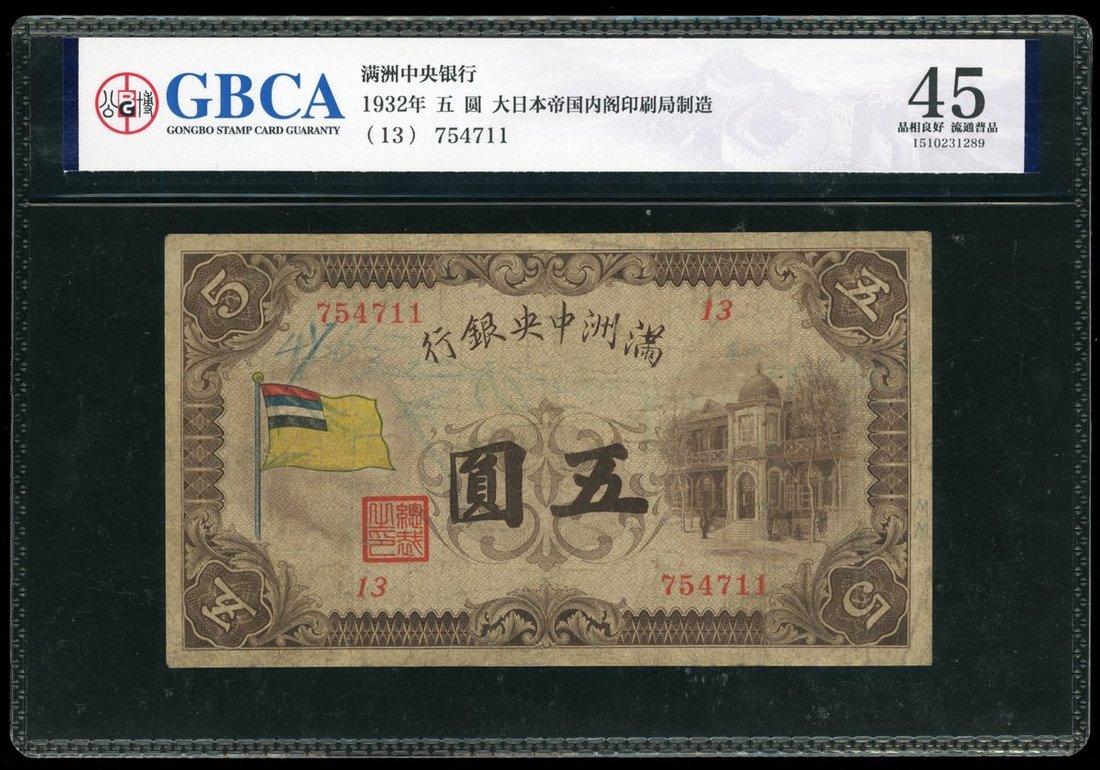 1933年滿洲中央銀行五圓,無日期,編號754711,VF品,有書寫,GBCA 45