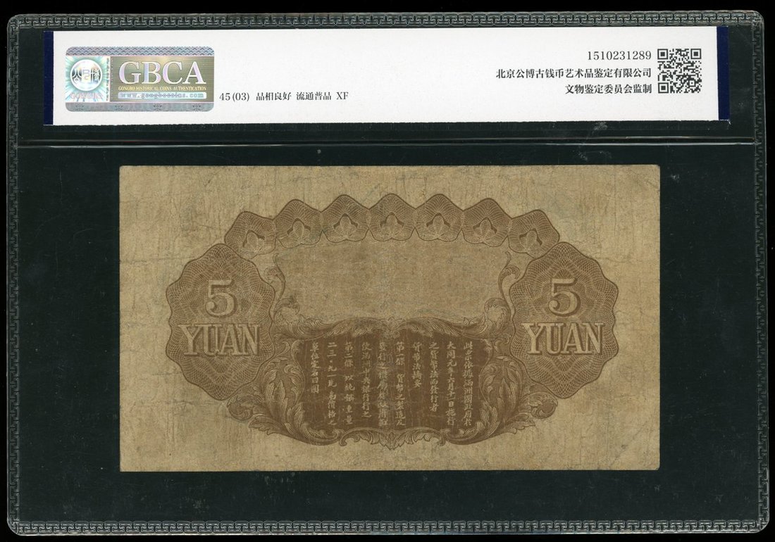 Central Bank of Manchukuo, China, 5 yuan, ND (1933), serial number 754711, (Pick J126a), Very Fine, Annotations, GBCA 45