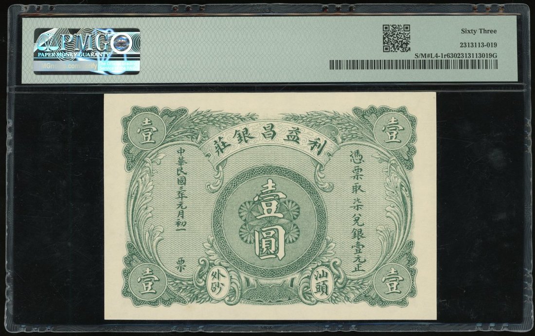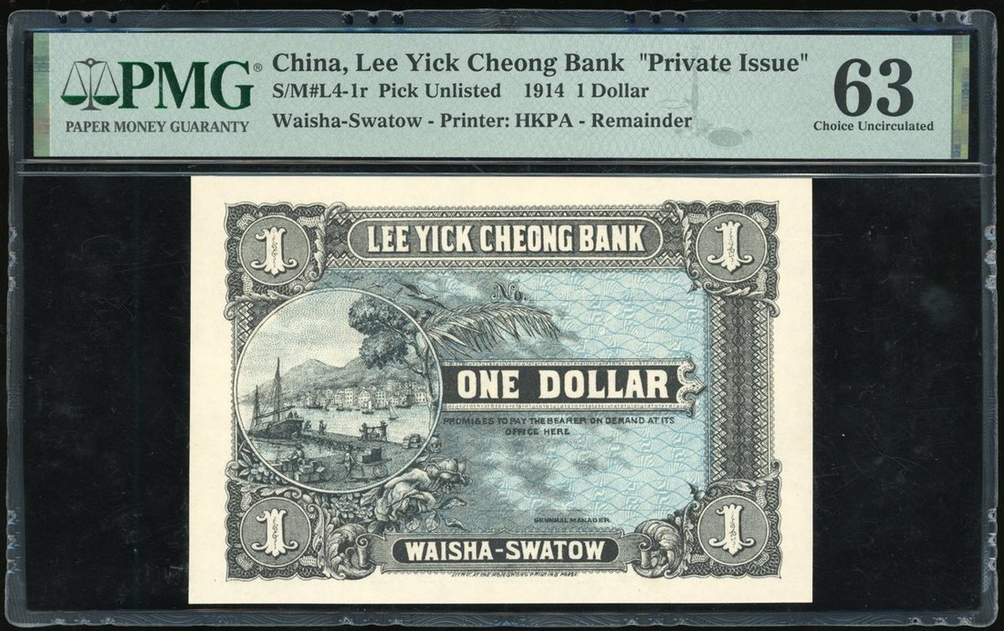 China, Private Issue, Lee Yick Cheong Bank, remainder 1 dollar, Year 3 (1914), no serial number, printed by Hong Kong Printing Press,