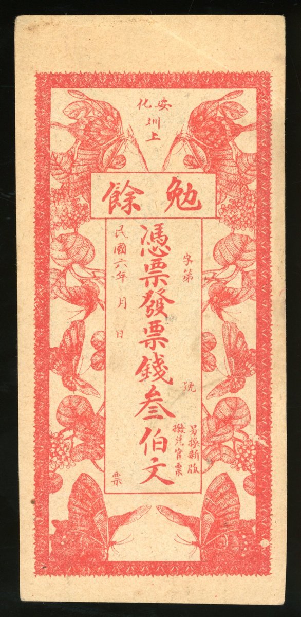 Private Issue, China, Honan, Anhua county, Mian Yu, remainder for 300 cash, Year 6 (1917), no serial number, vertical format,