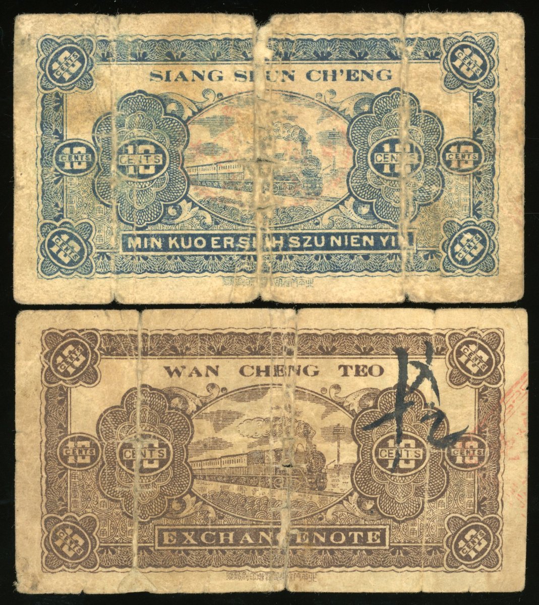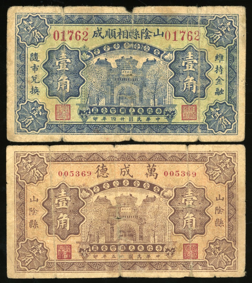 (x) Private Bank, Shansi Province, a pair of 10 cents, 1935 and 1936, Siang Shun Cheng Bank and Wan Cheng Teo Bank, serial number 01762 and 005369 respectively, blue and brown, similar design with gateway at centre,