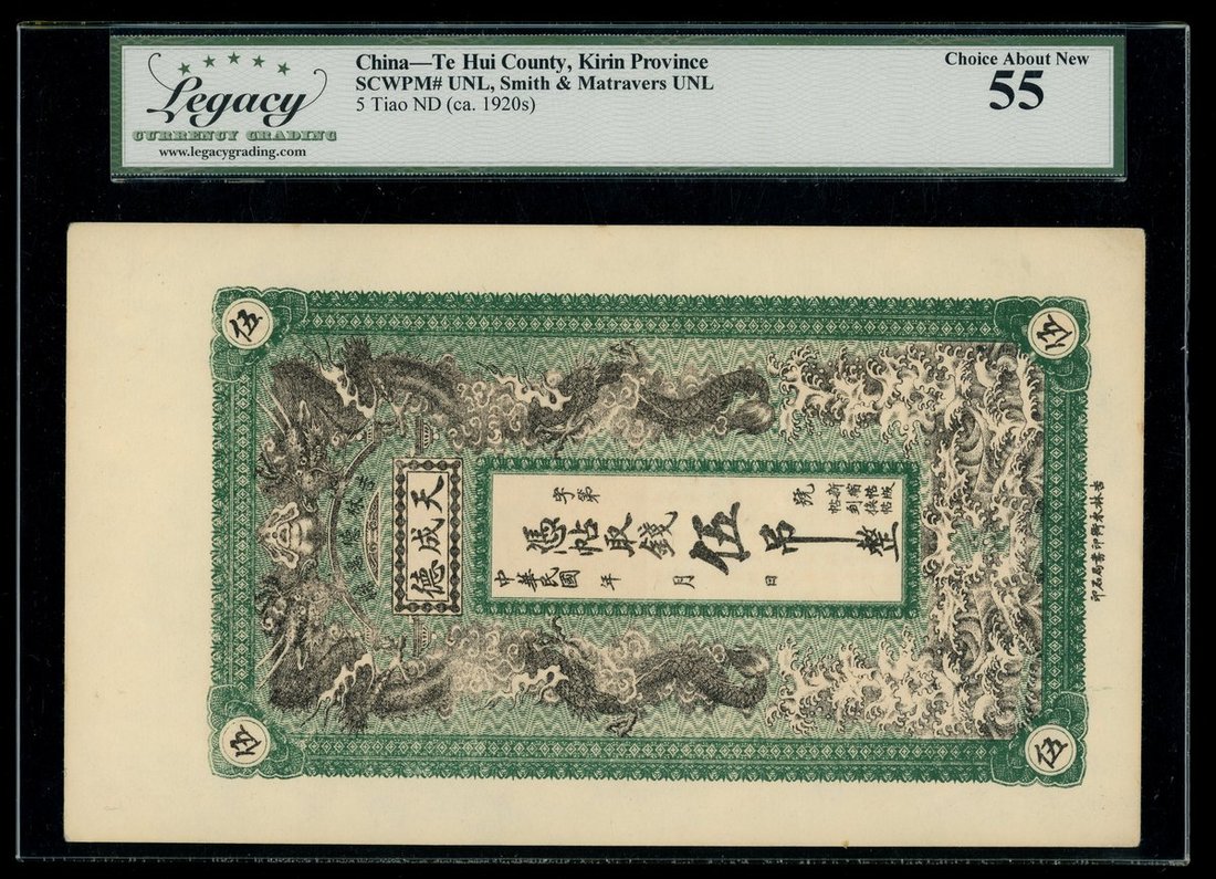 Private Issue, Kirin Province, 5 tiao, Republican era, Tian Cheng De, remainder, black and green, facing dragons flanking bank name and denomination,