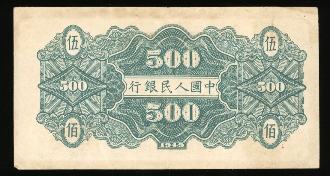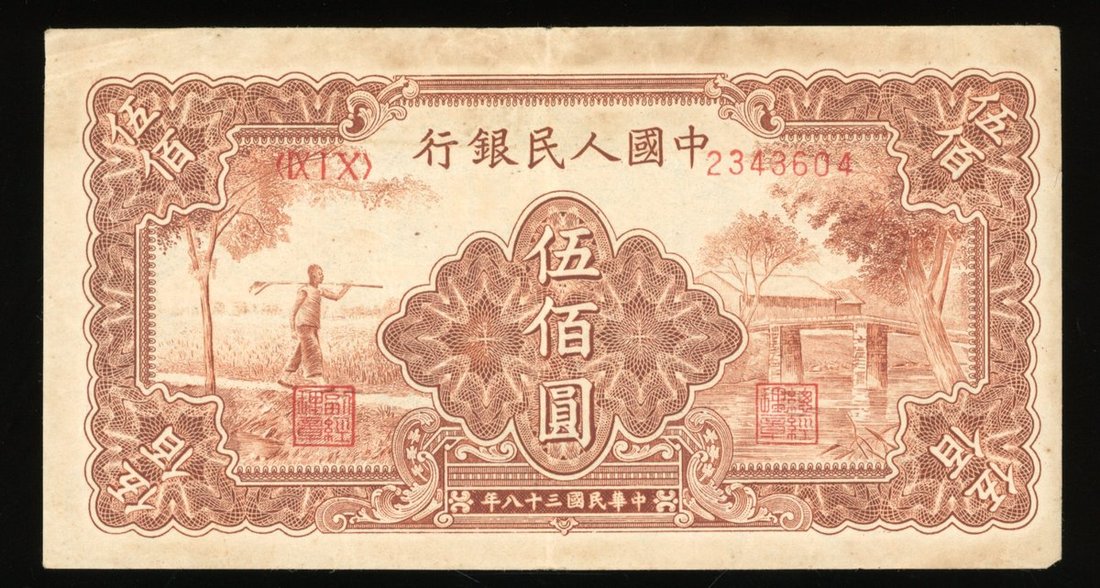 1949年中國人民銀行第一版人民幣伍佰圓「農民與小橋」,編號 IX I X 2342604,aVF品相