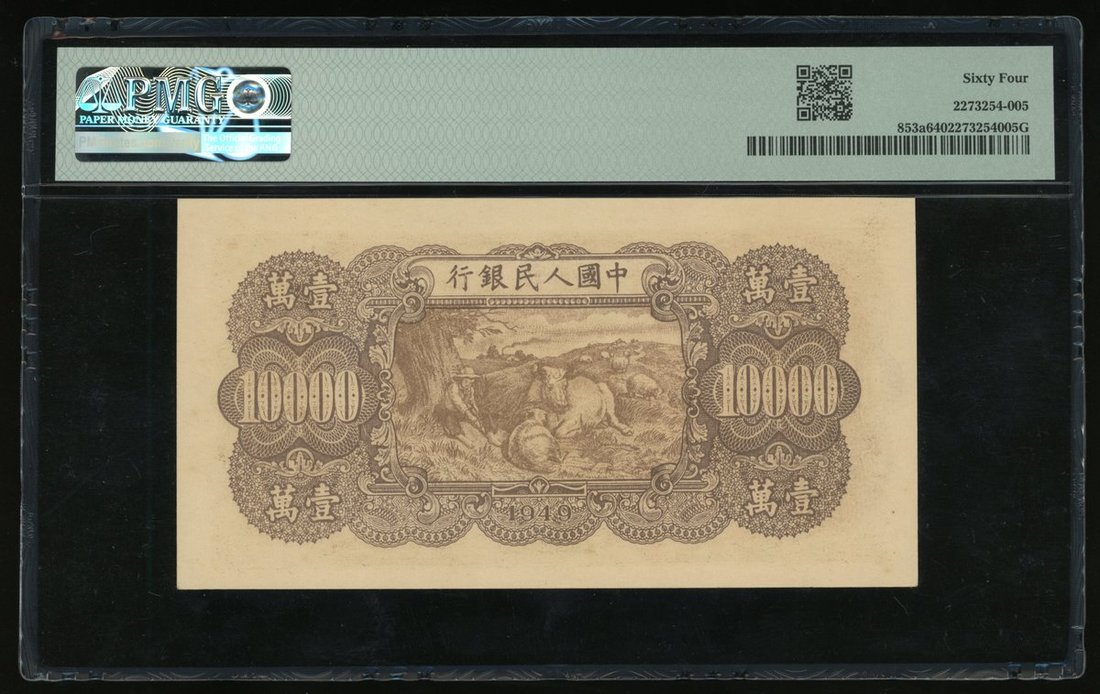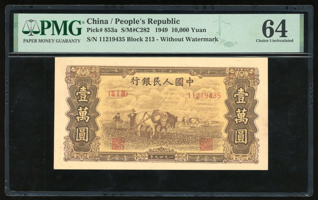1949年中國人民銀行第一版人民幣壹萬圓「雙馬耕地」,編號 II I III 11219435,PMG 64