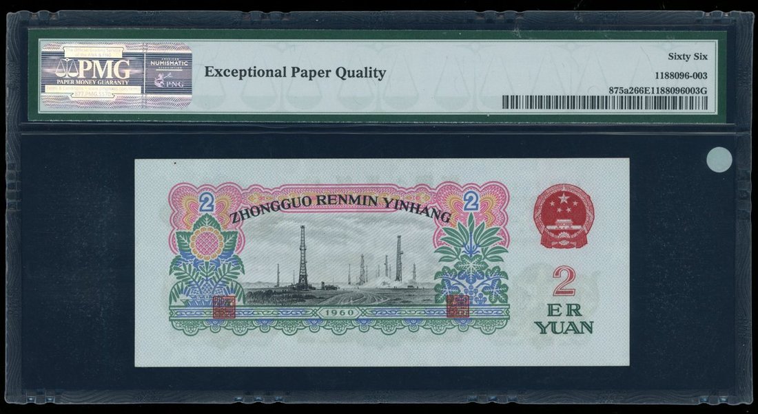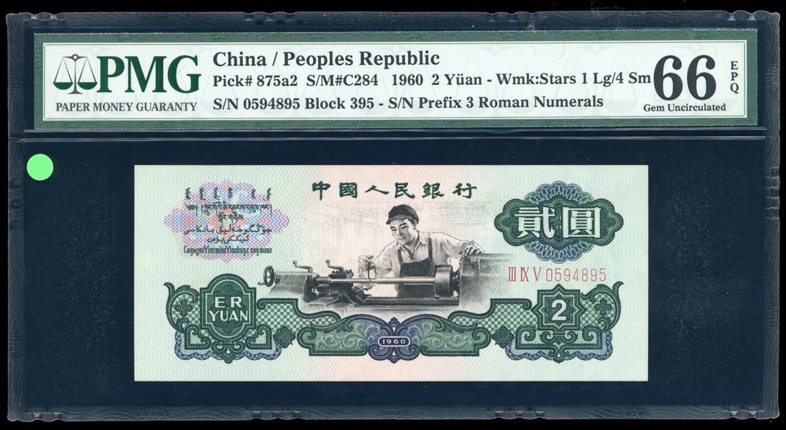 1960年中國人民銀行第三版人民幣貳圓,編號 III IX V0594895,帶星水印,PMG 66EPQ