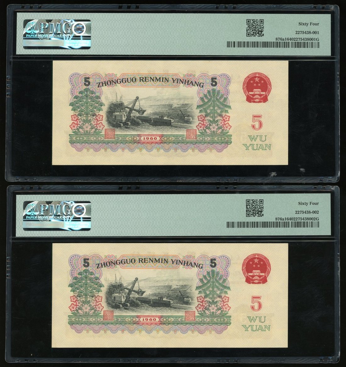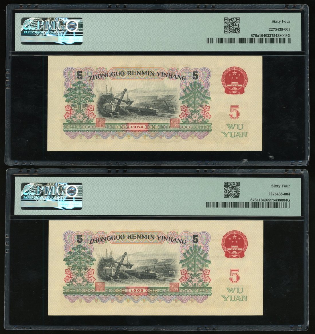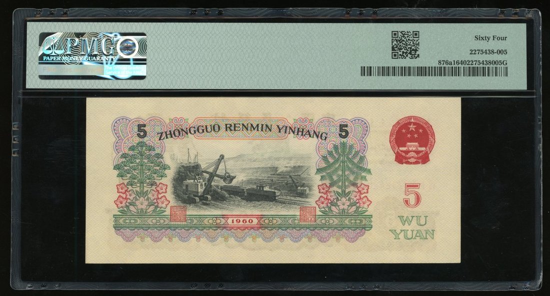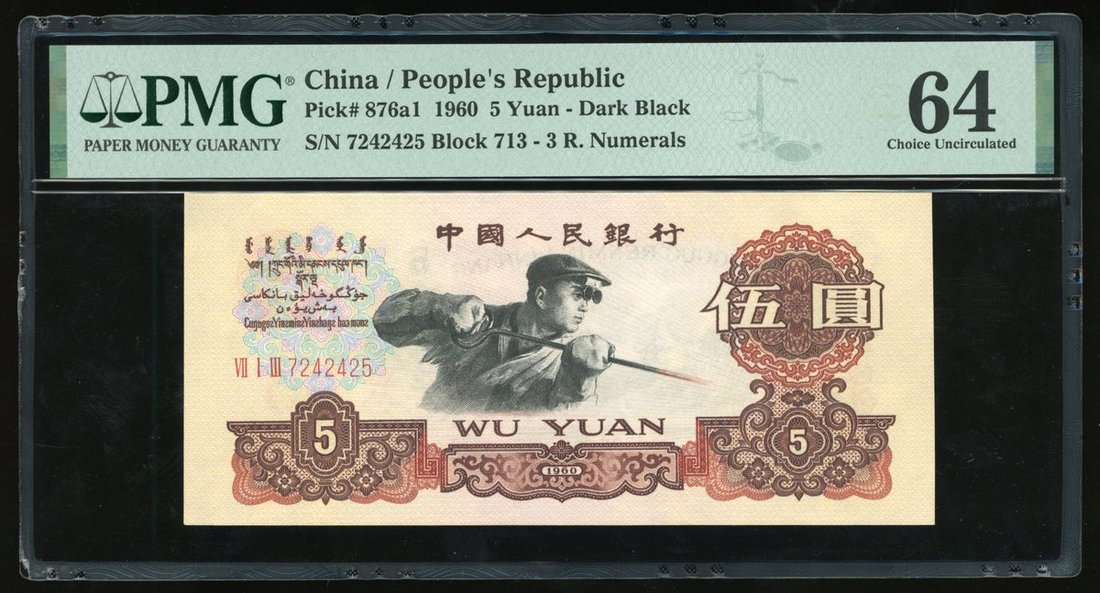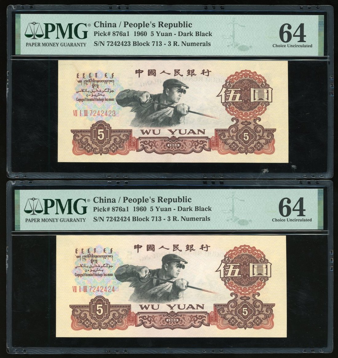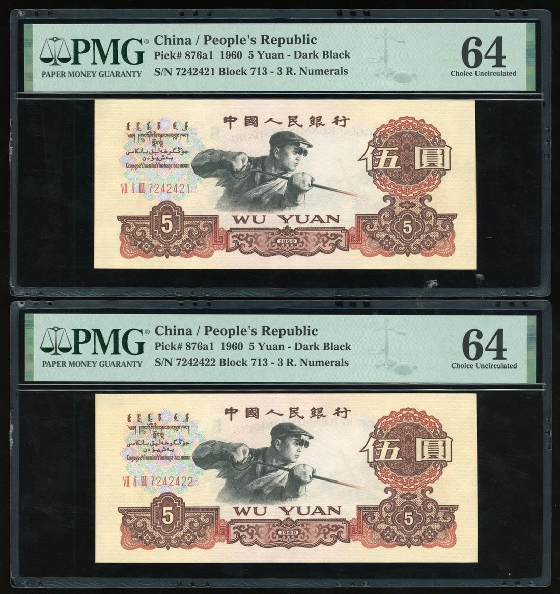 1960年中國人民銀行第三版人民幣伍圓一組5枚,炭黑版,連號VII I III 7242421/22/23/24/25,PMG 均評64