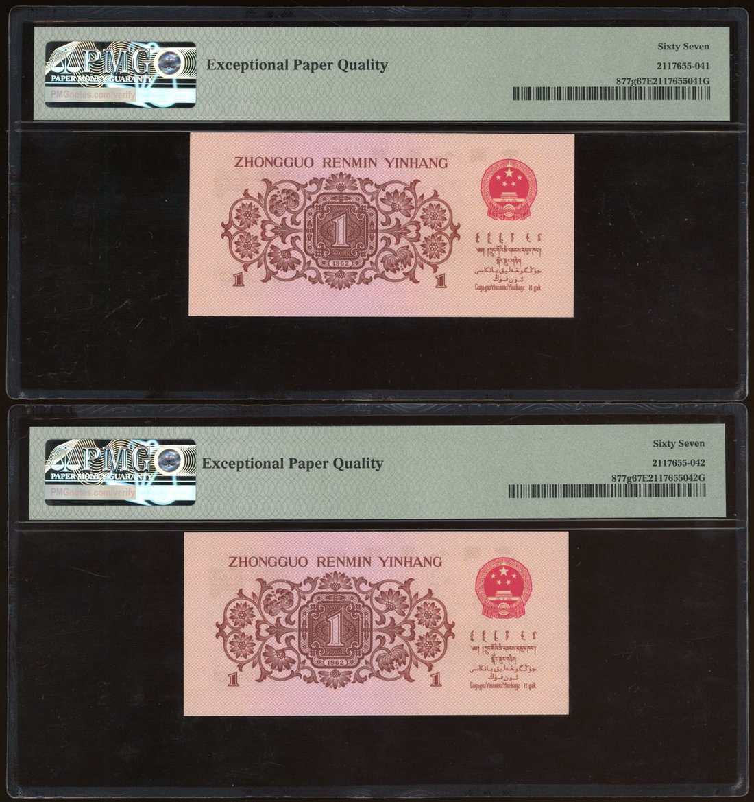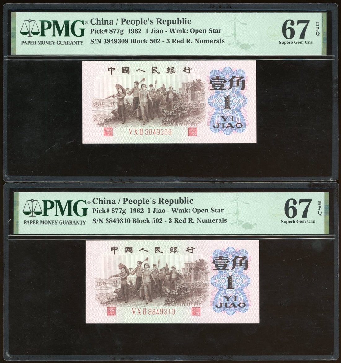 People's Bank of China, 3rd Series Renminbi, 1962, consecutive 1 jiao, 1962, serial number V X II 3829309/310, (Pick 877g), PMG 67EPQ (2)