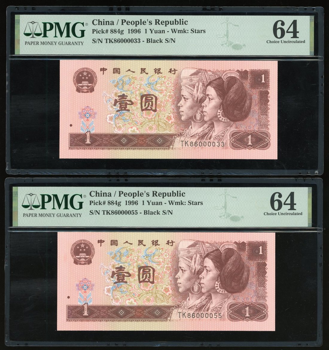 People's Bank of China, 4th Series Renminbi, 1996, 1 yuan (2), black serial numbers TK86000033 and TK86000055,