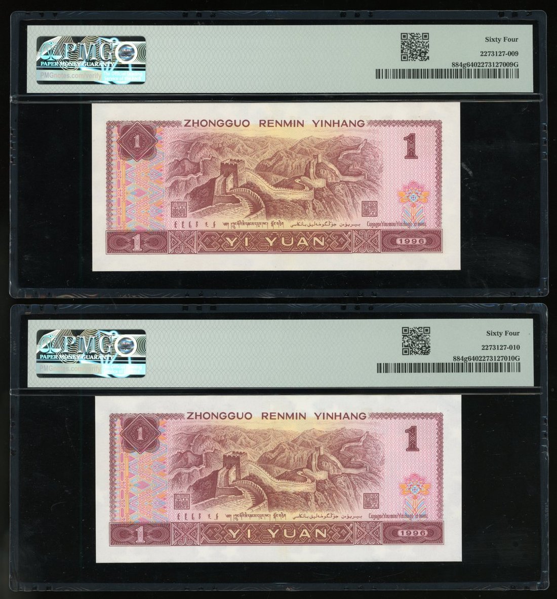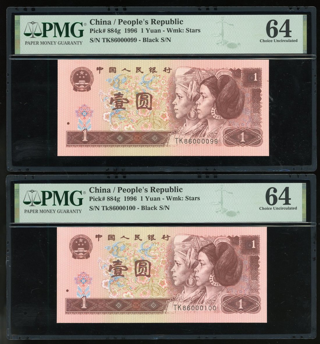 People's Bank of China, 4th Series Renminbi, a consecutive pair of 1 yuan, 1996, serial number TK86000099-0100, (Pick 884g), PMG 64.(2)