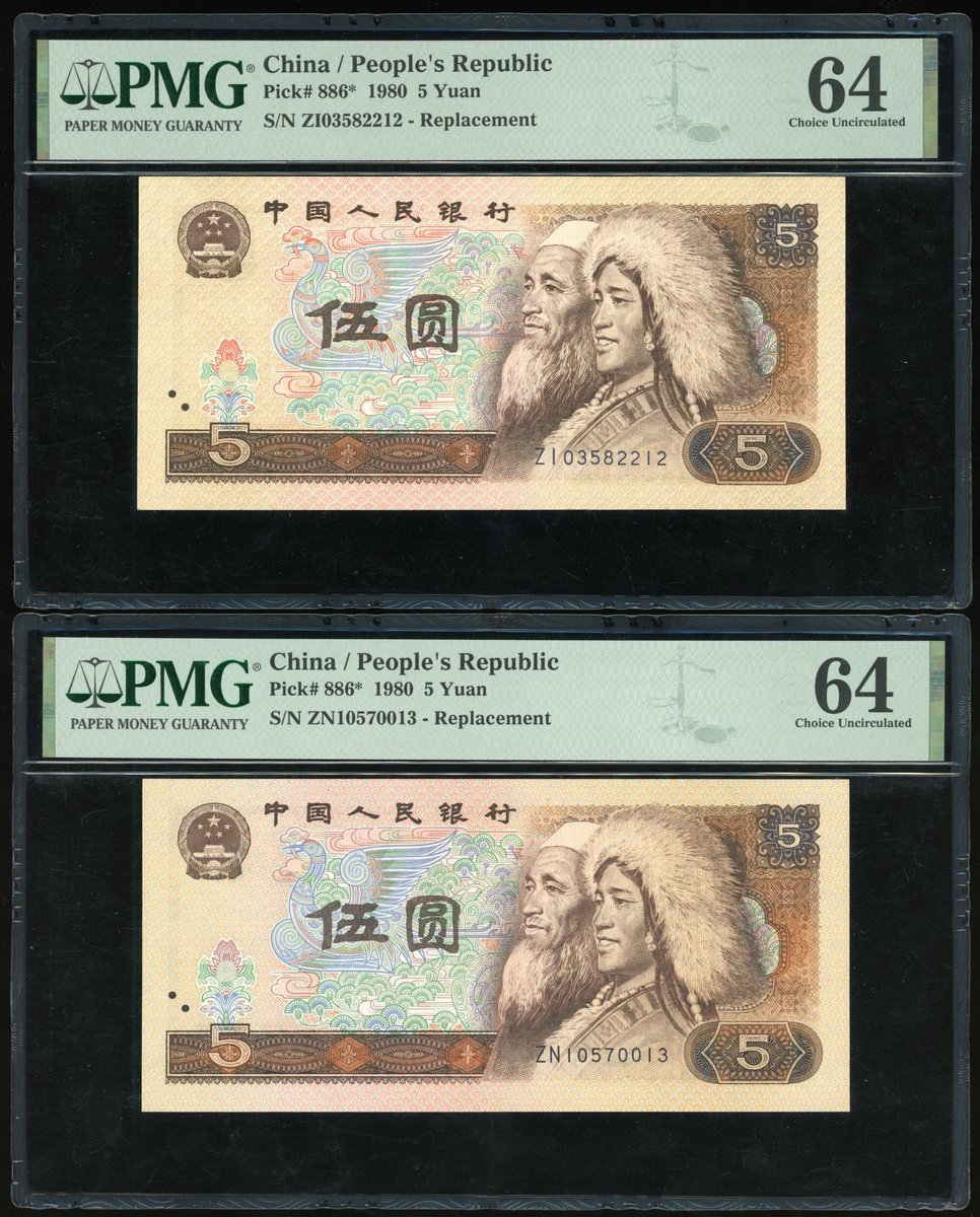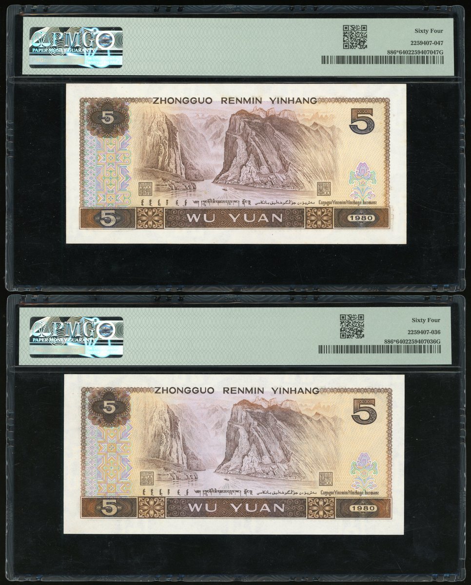 1980年中國人民銀行第四版人民幣補版伍圓一組2枚,編號 ZI 03582212,ZN 10570013,均 PMG 64