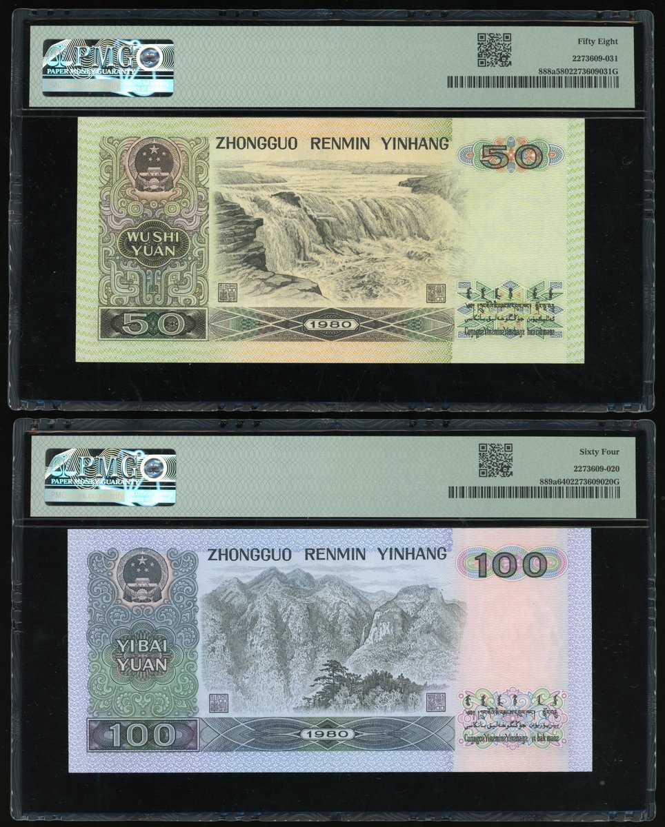 1980年中國人民銀行第四版人民幣一組兩枚, 包括伍拾及壹百圓, 編號 CR60122280, CX76367802, PMG 58, 64