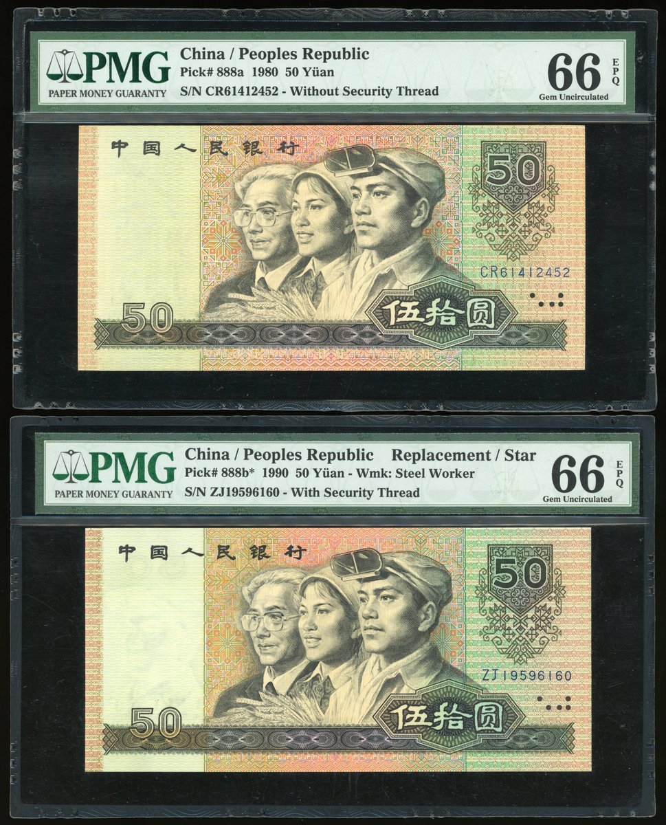 1980/1990年中國人民銀行第四版人民幣伍拾圓一組2枚,編號 CR 61412452,ZJ 19596160,均 PMG 66EPQ